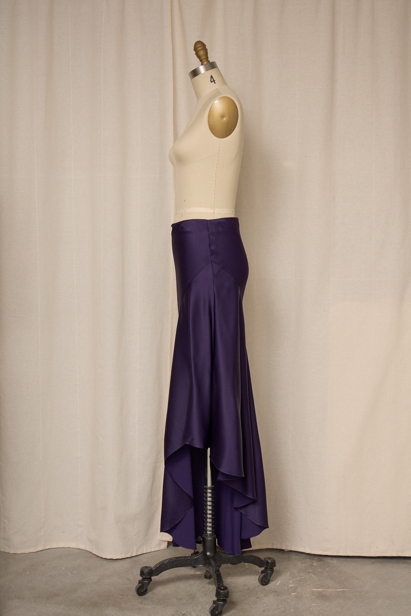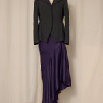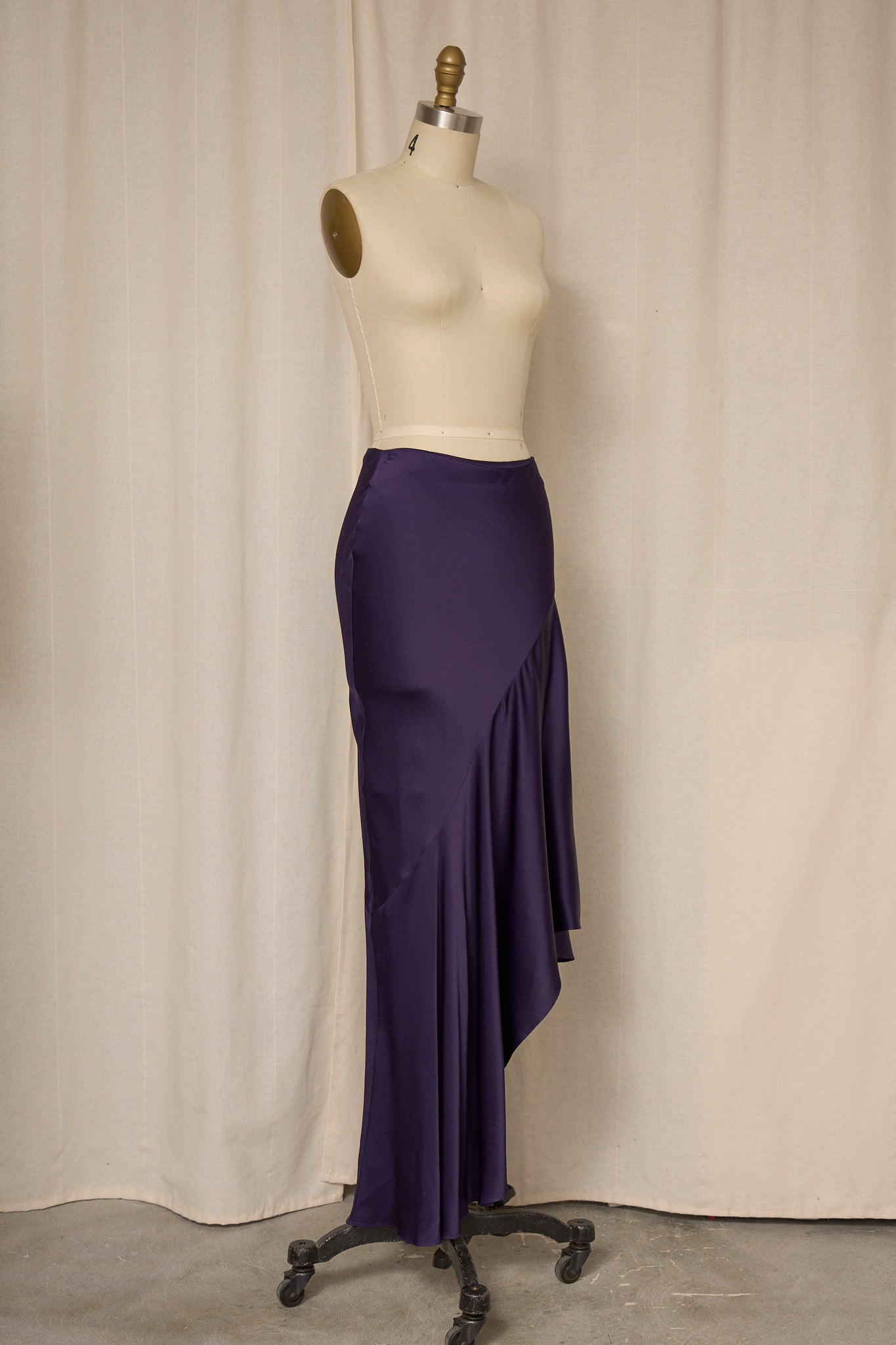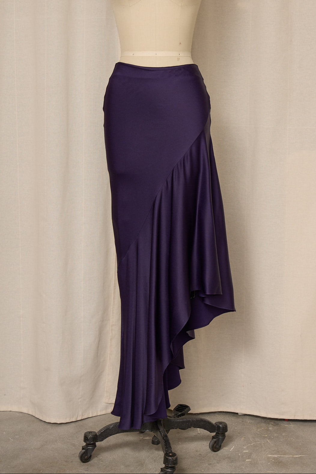 Vintage rich purple asymmetrical long skirt in satin fabric with zipper closure at waist. Very good vintage condition, no flaws or signs of wear.