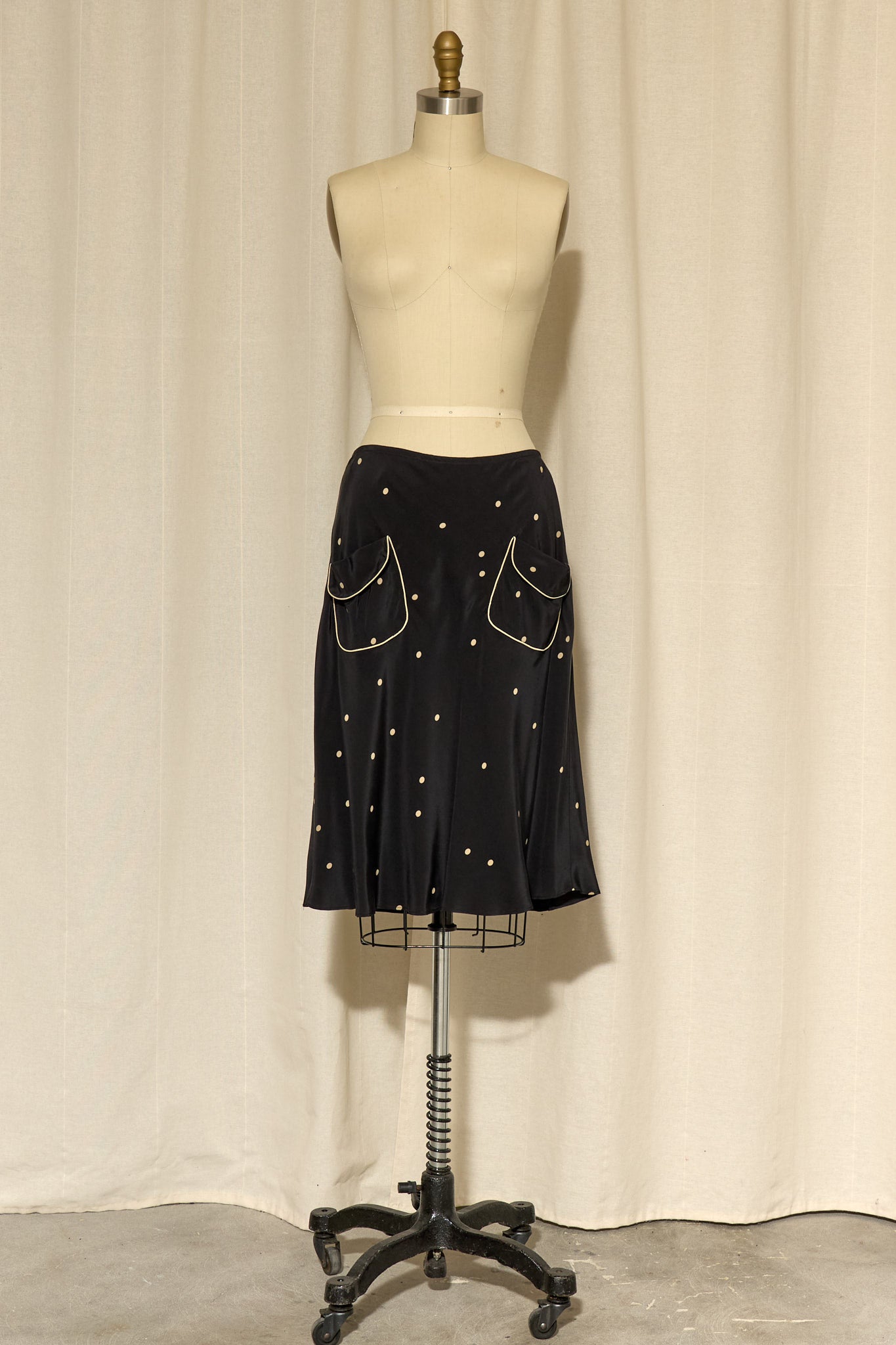Black silk skirt with cream polka dots and front pockets with cream piping. Fully lined, in very good condition