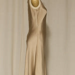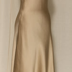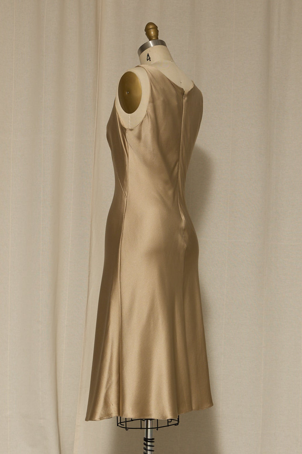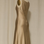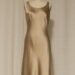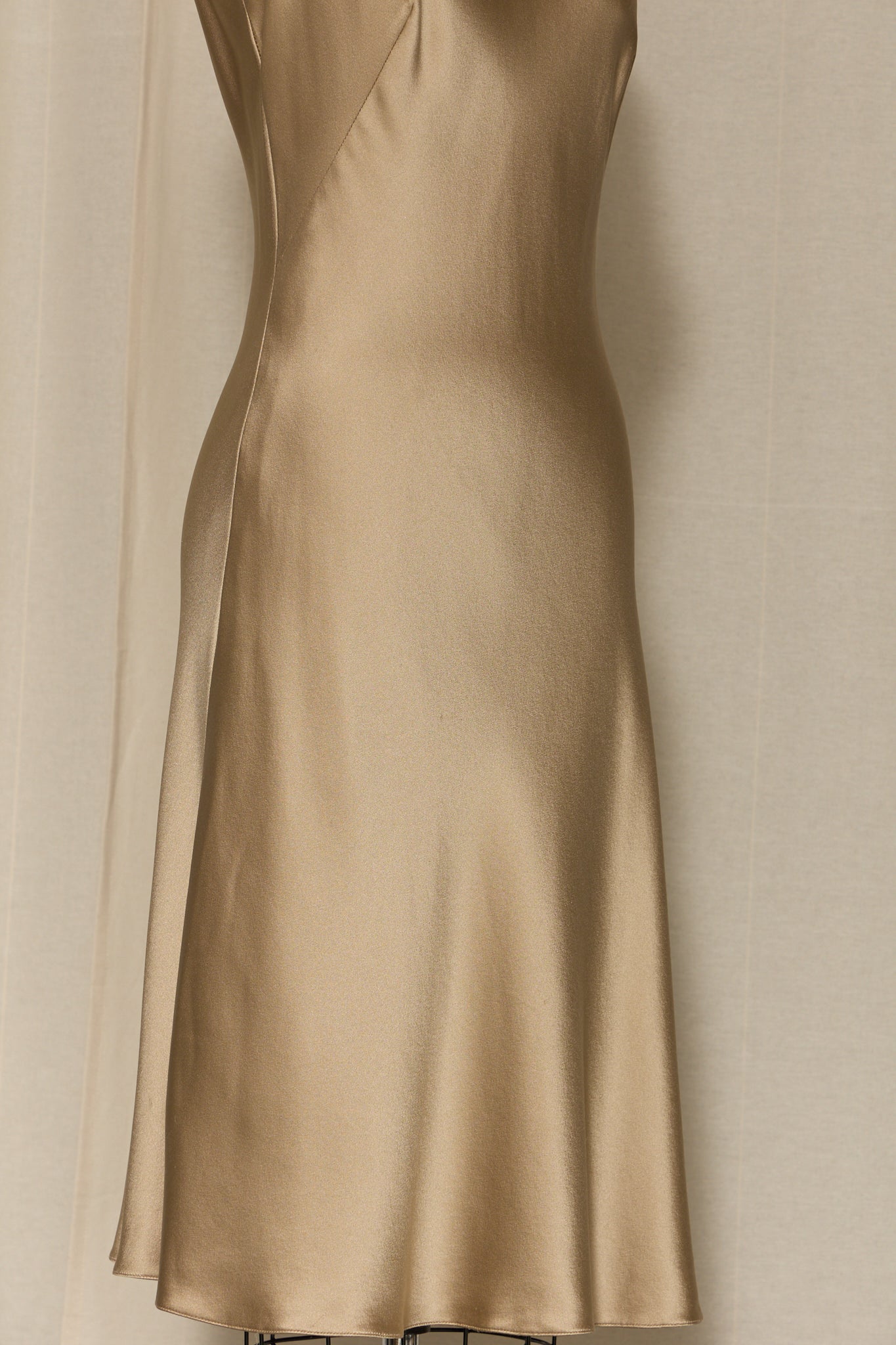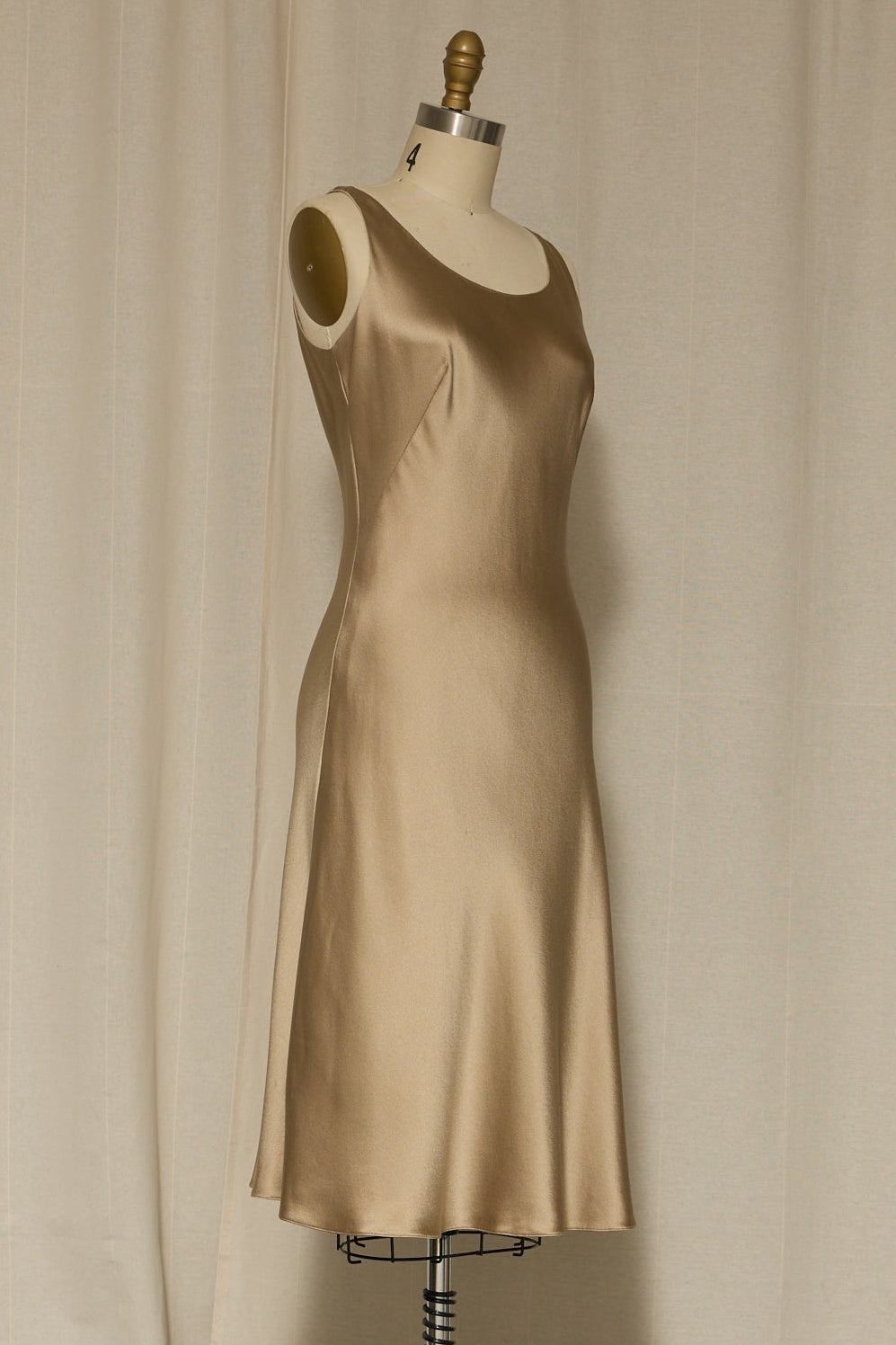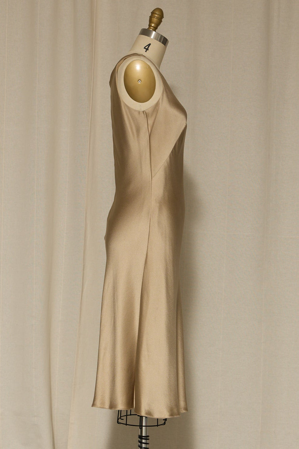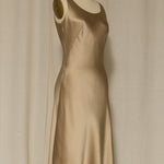 Minimal, elegant, and silky—this vintage gold slip dress drapes beautifully with a soft sheen and clean A-line silhouette. A timeless piece perfect for layering or wearing on its own. Very good vintage condition with minor, hardly noticeable snags. Shown on a size 4 mannequin.