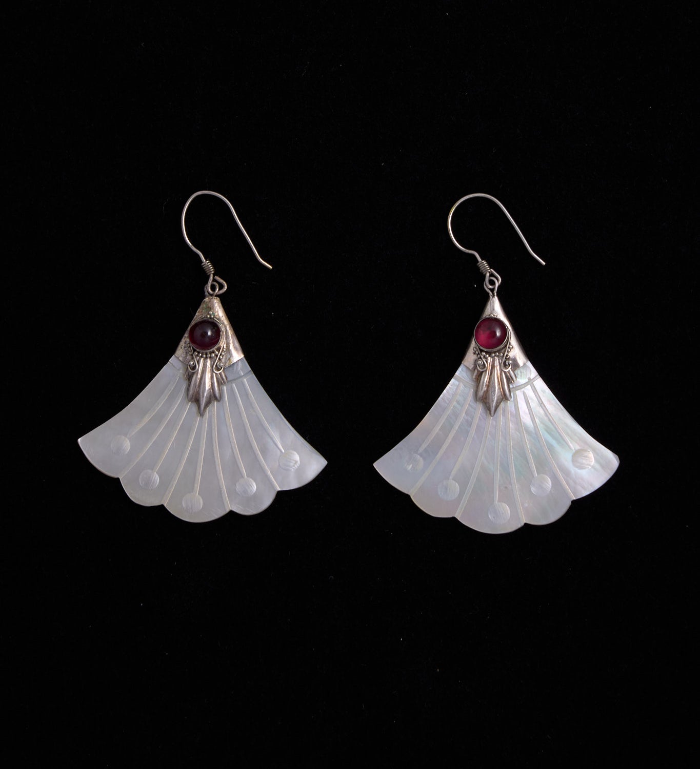 Vtg Carved Mother of Pearl Fan Dangle Earrings Garnet 925 Sterling Silver