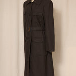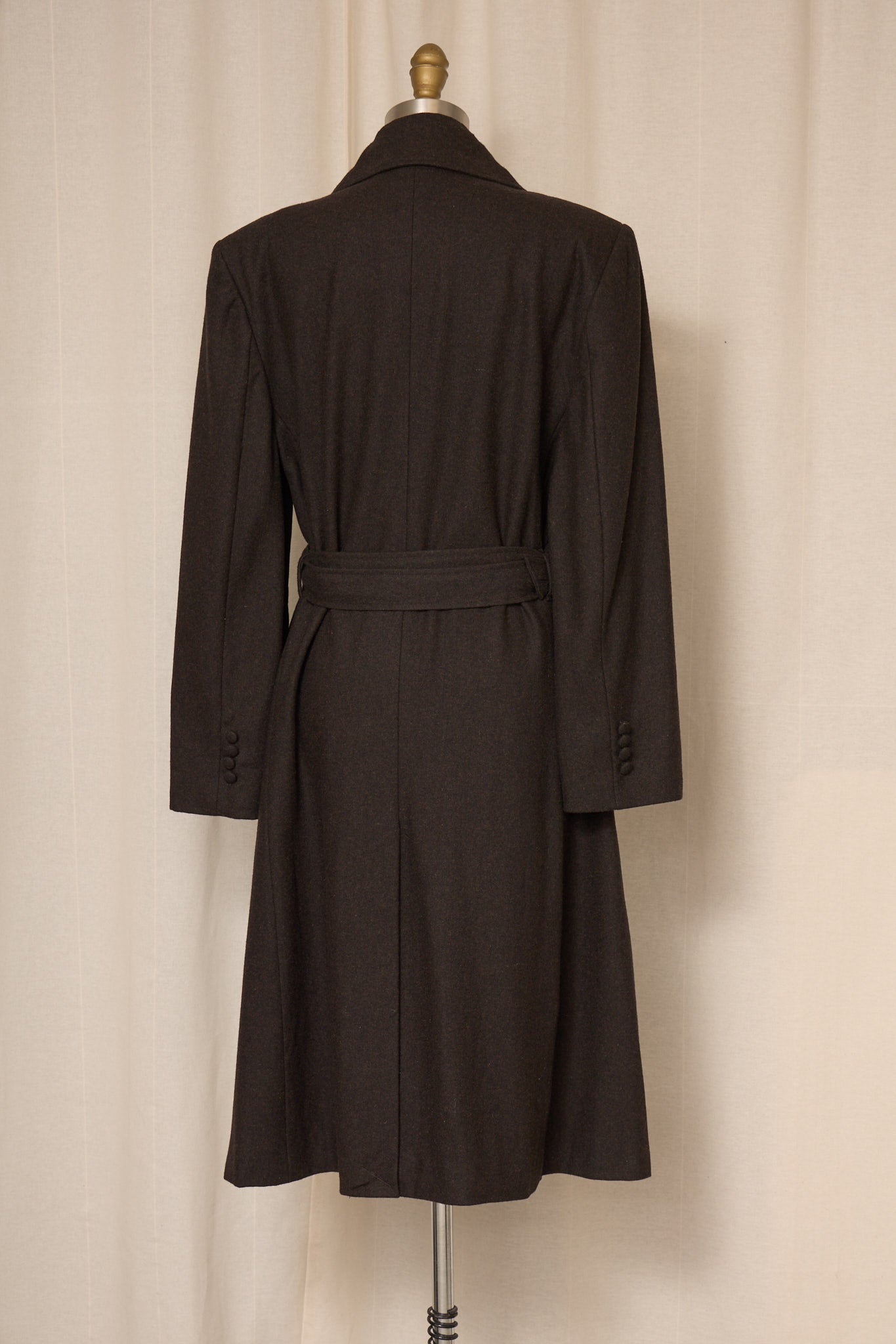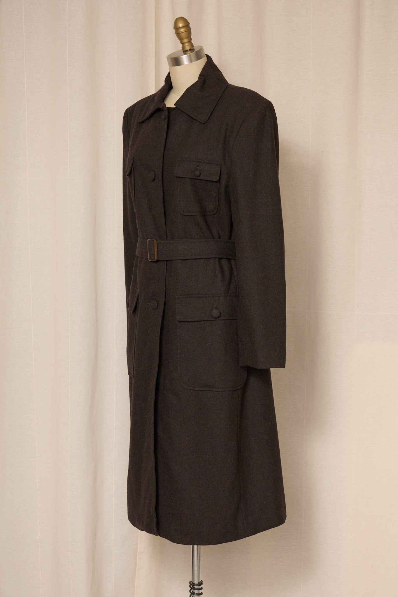Vintage brown wool belted coat with structured tailoring, flap pockets, and classic silhouette. Fully lined. Timeless everyday outerwear.