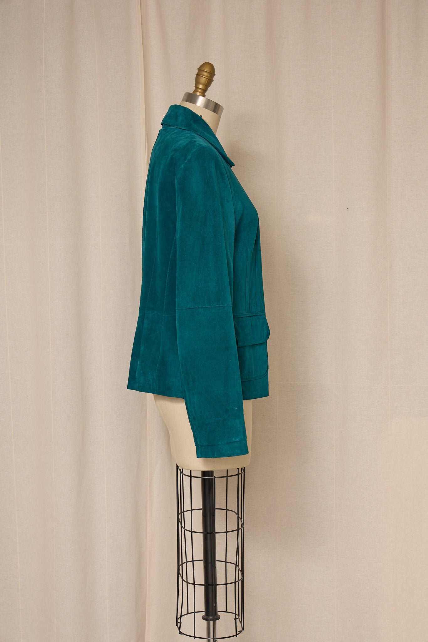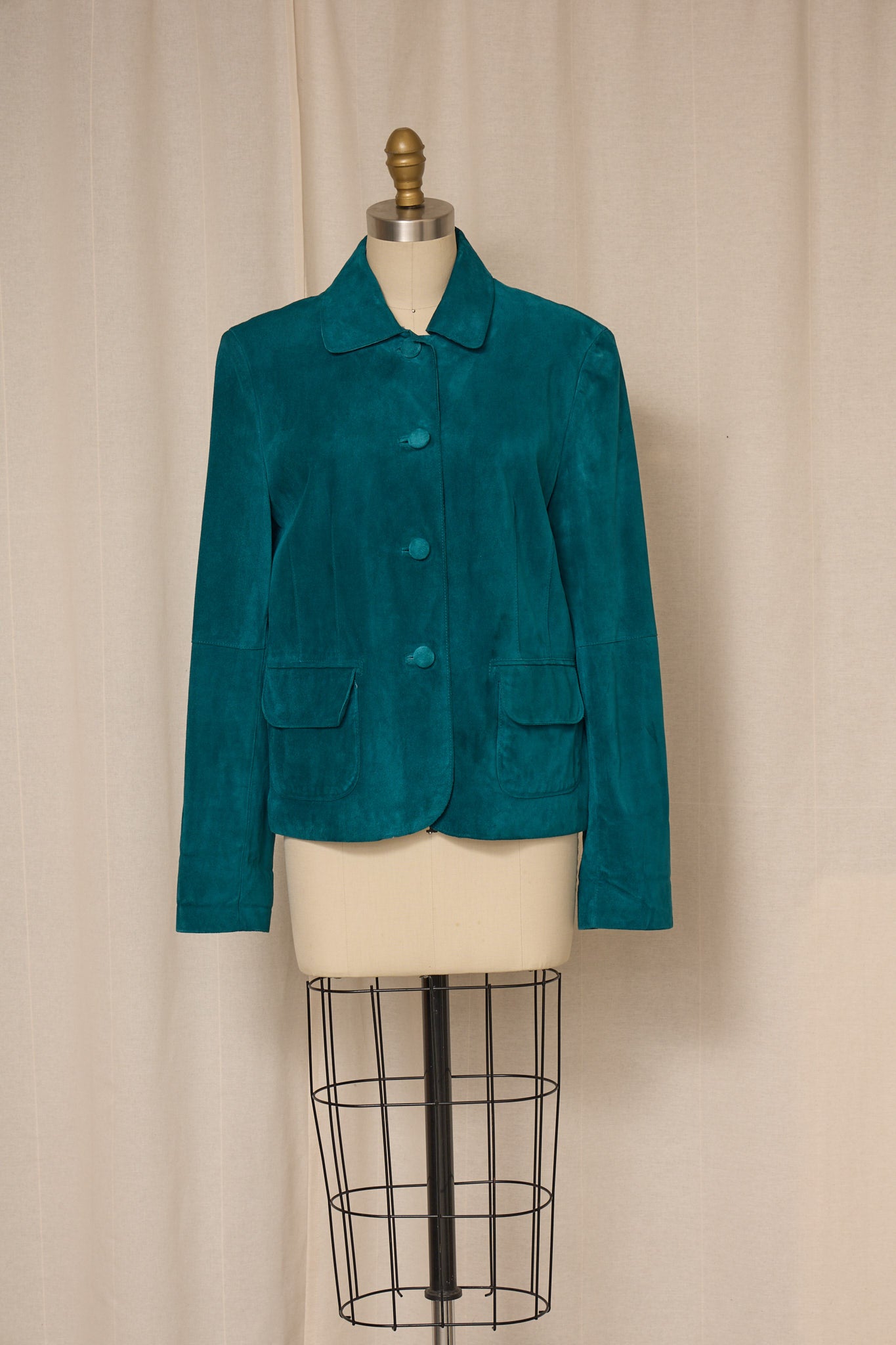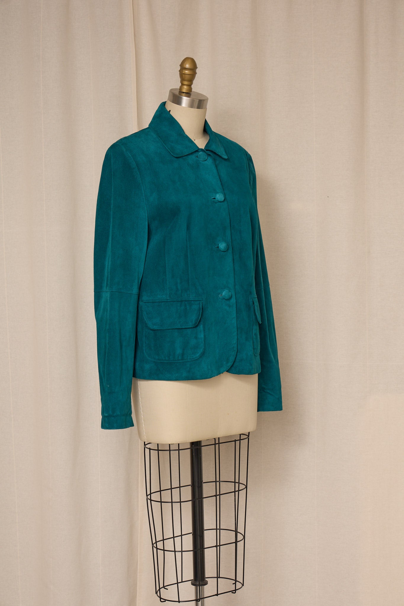 Blue suede jacket with structured fit. 100% suede leather outer with synthetic inner lining. Button front closure, two front pockets. Very good vintage condition, no flaws or damage.