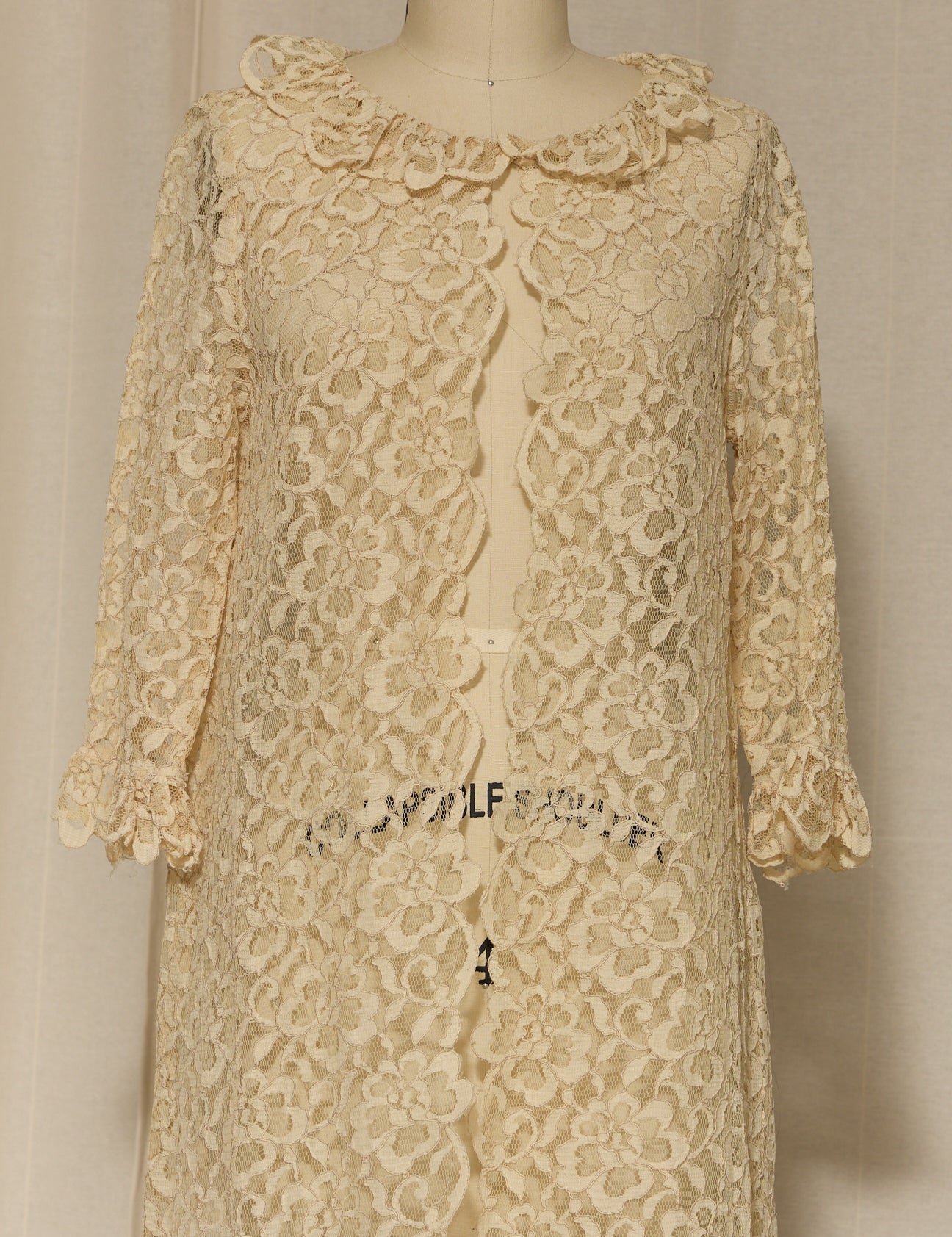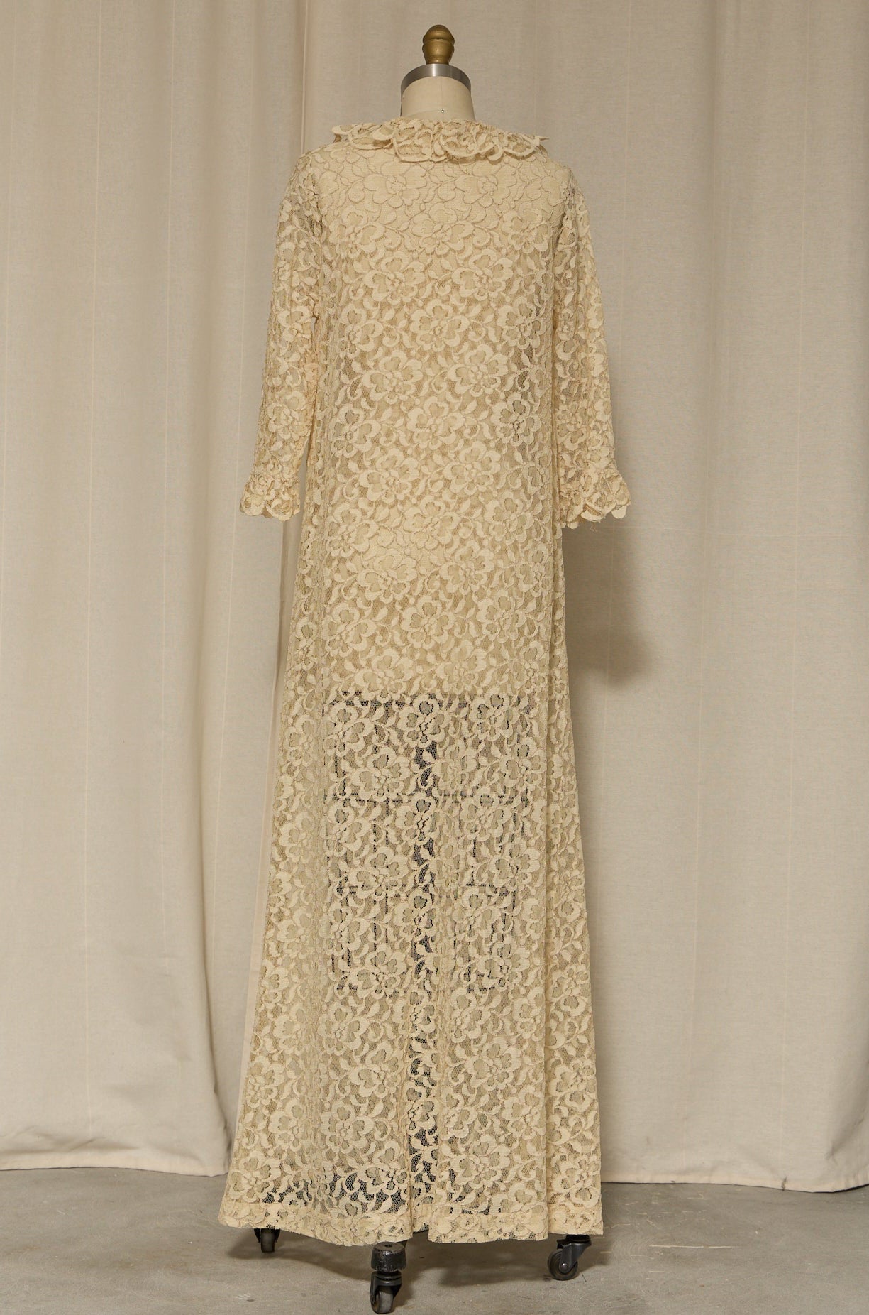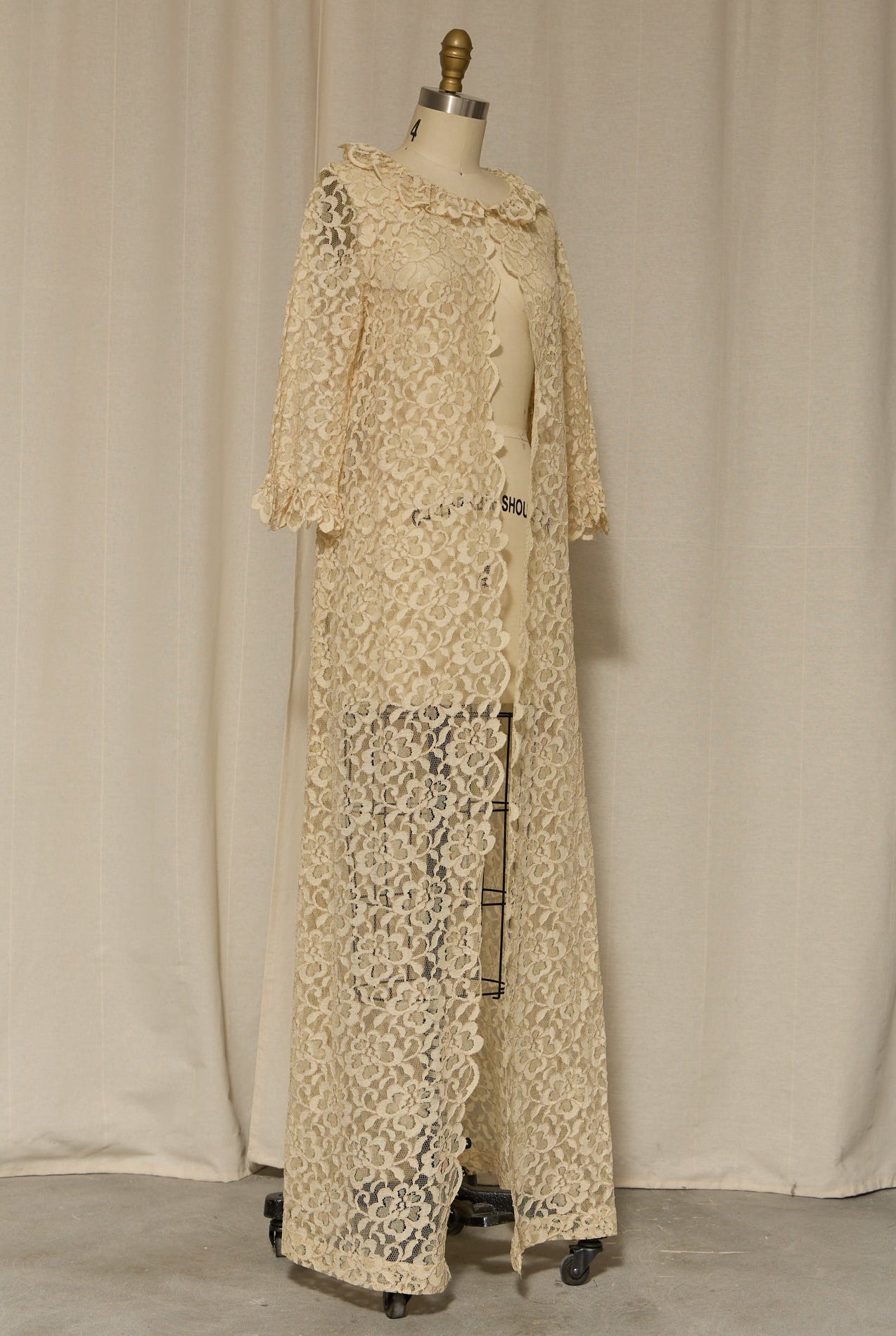 Romantic and ethereal, this vintage ivory lace duster features an all-over floral pattern, a soft scalloped edge, and a lightweight, sheer drape. Worn open, it creates a beautiful elongated silhouette—perfect over slips, dresses, or evening looks. Very good vintage condition. Shown on a size 4 mannequin.