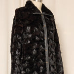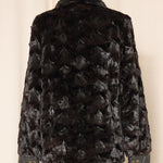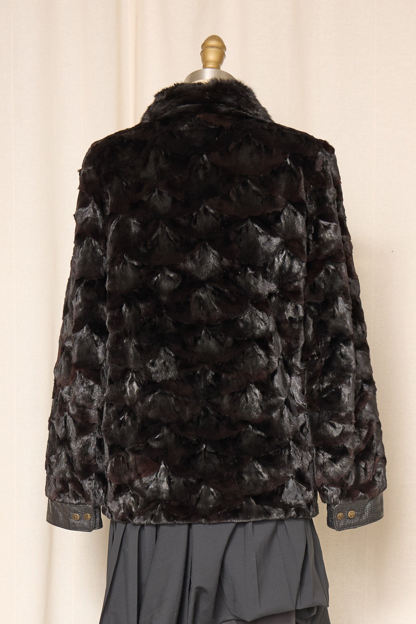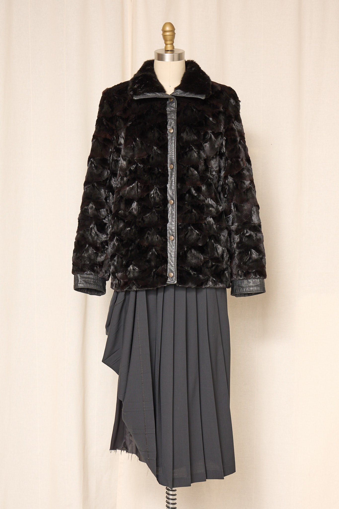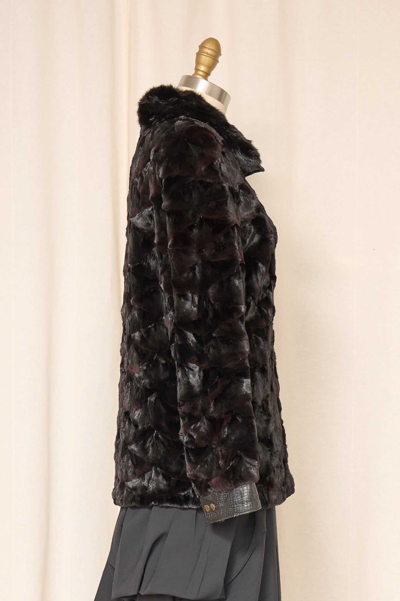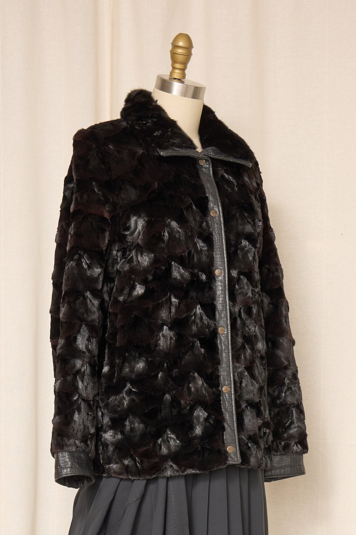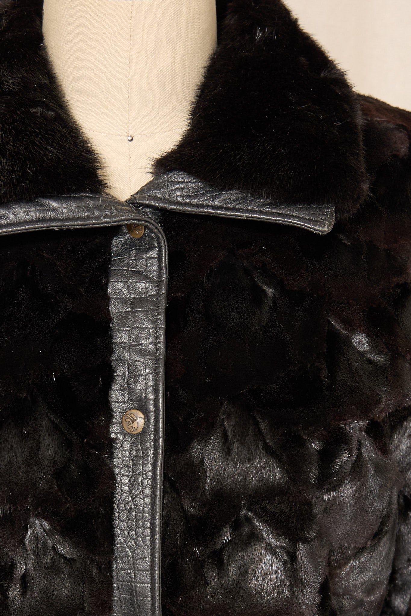 Vintage trimmed fur jacket with button-front closure and contrast leather trim at collar and cuffs. Cropped silhouette in deep black with rich texture. No fabric tag present; based on look and construction, we assume this piece is trimmed mink. Very good vintage condition.