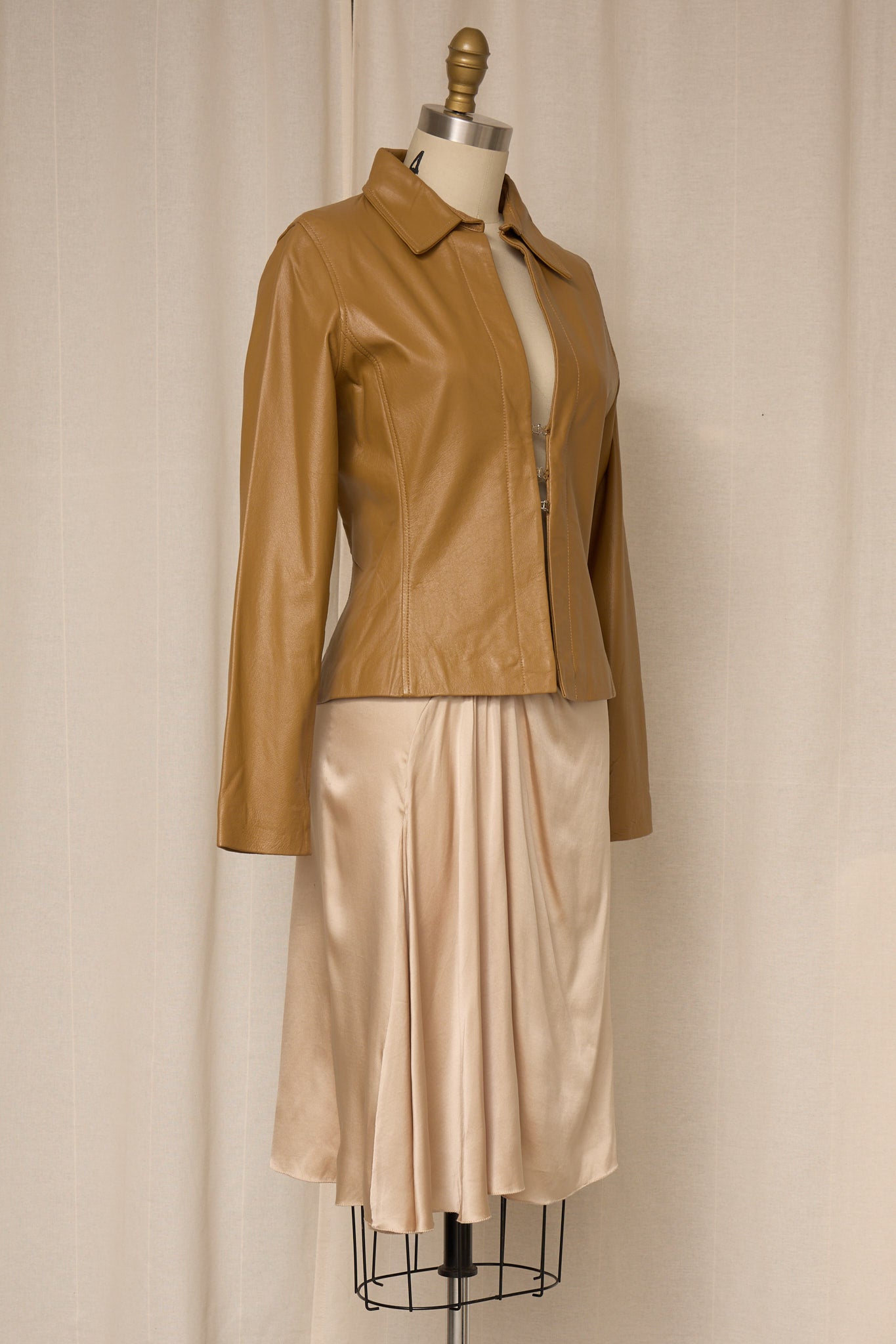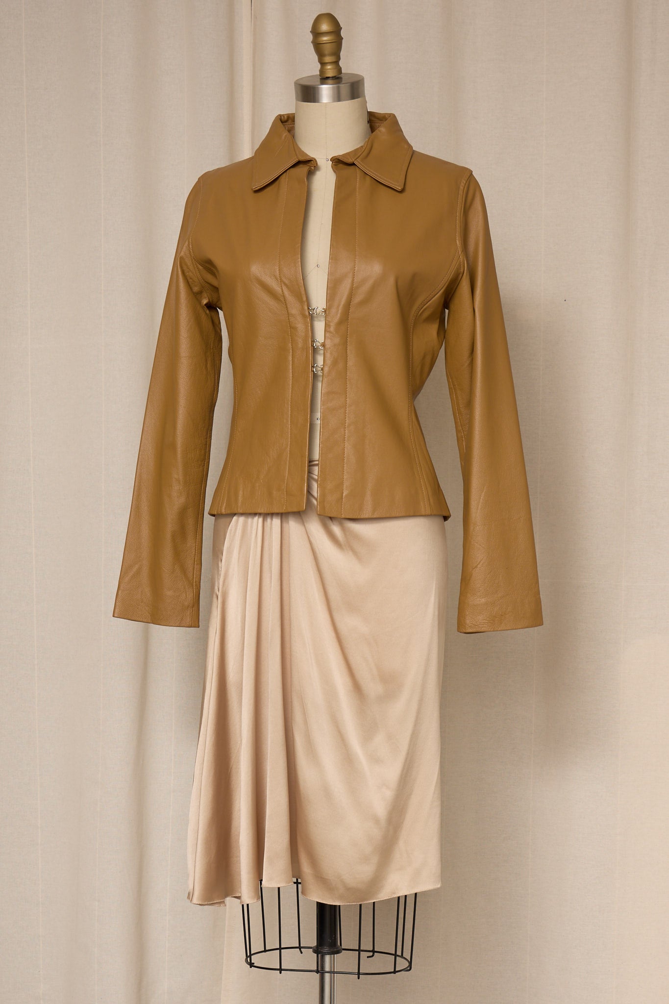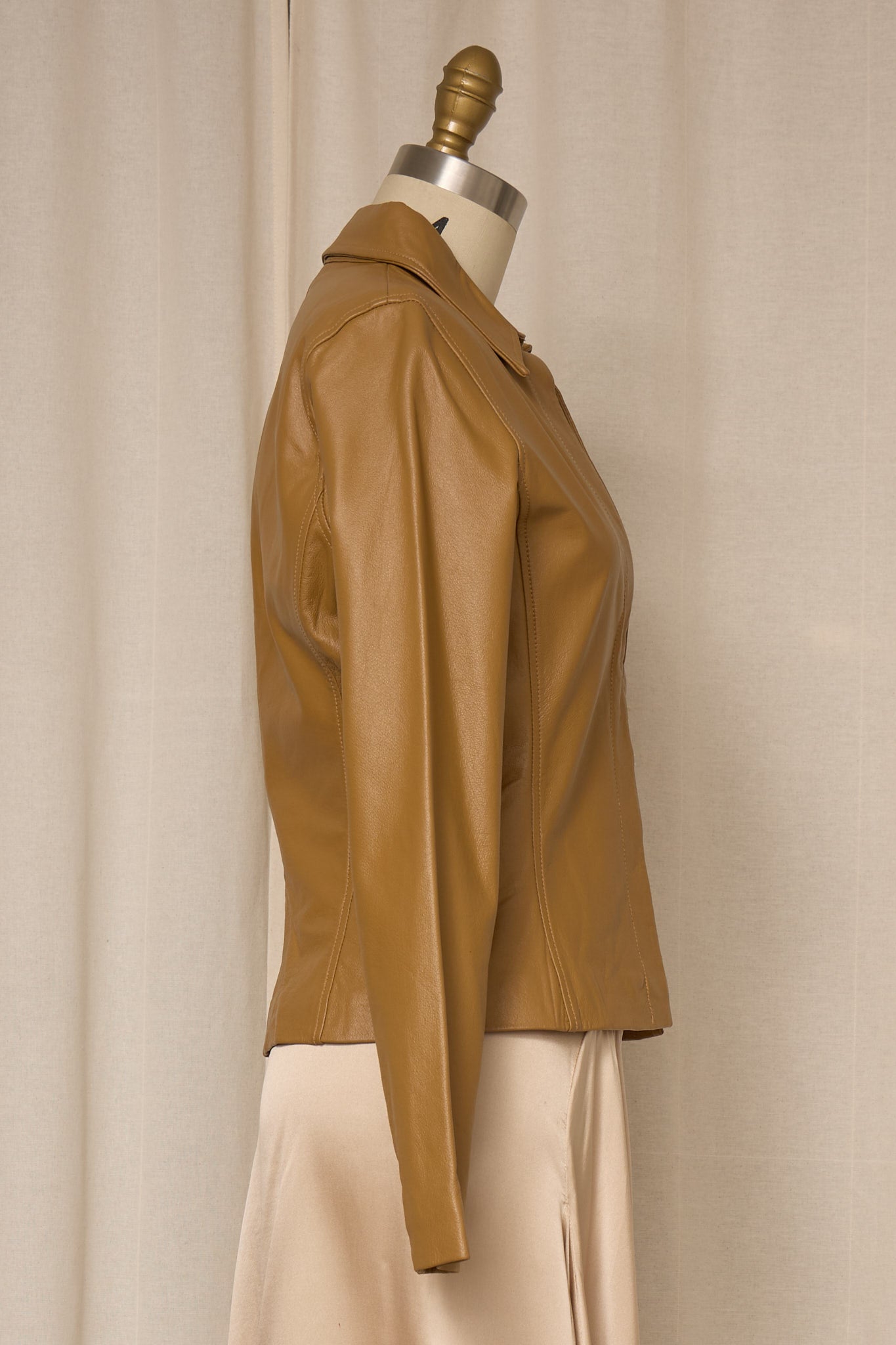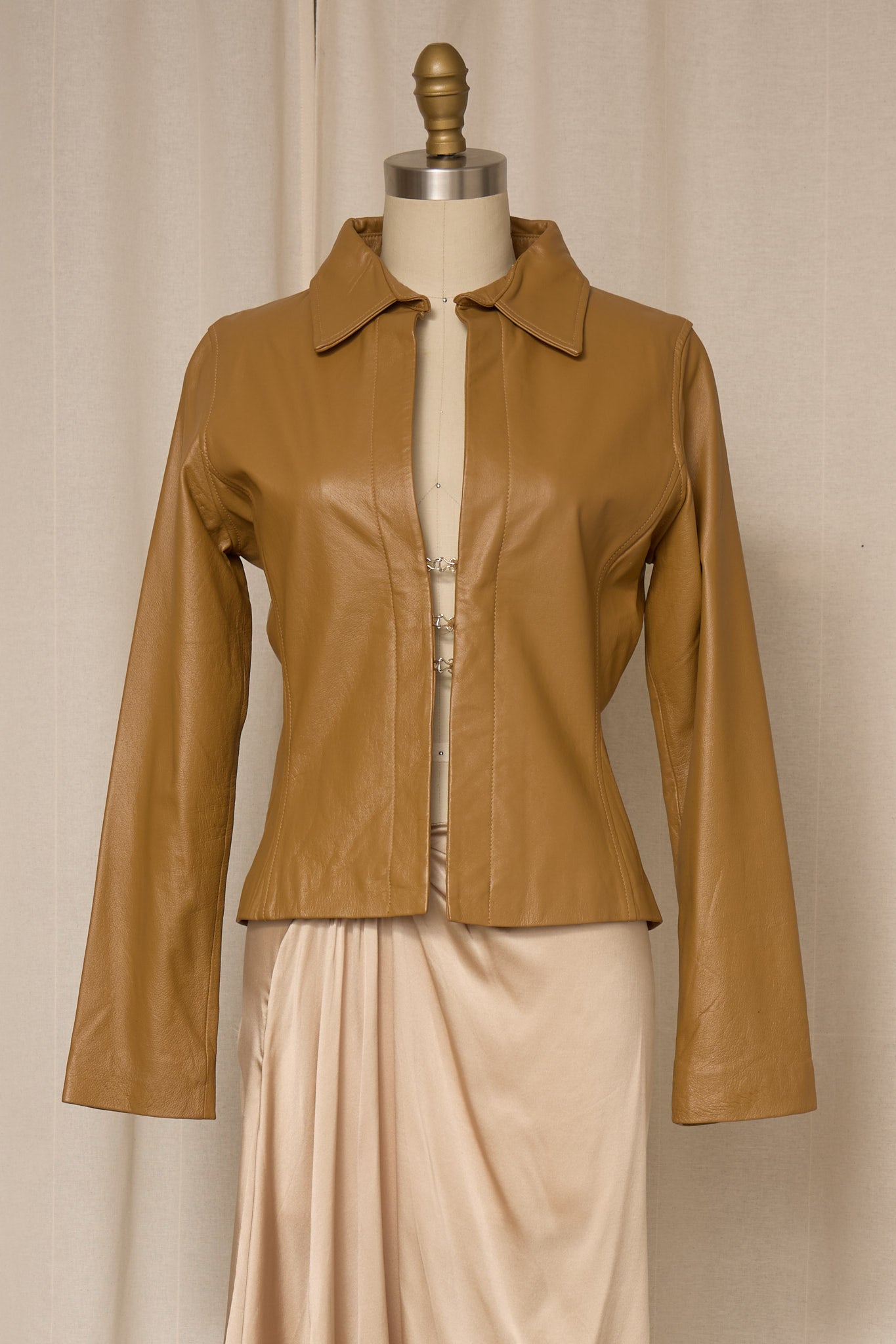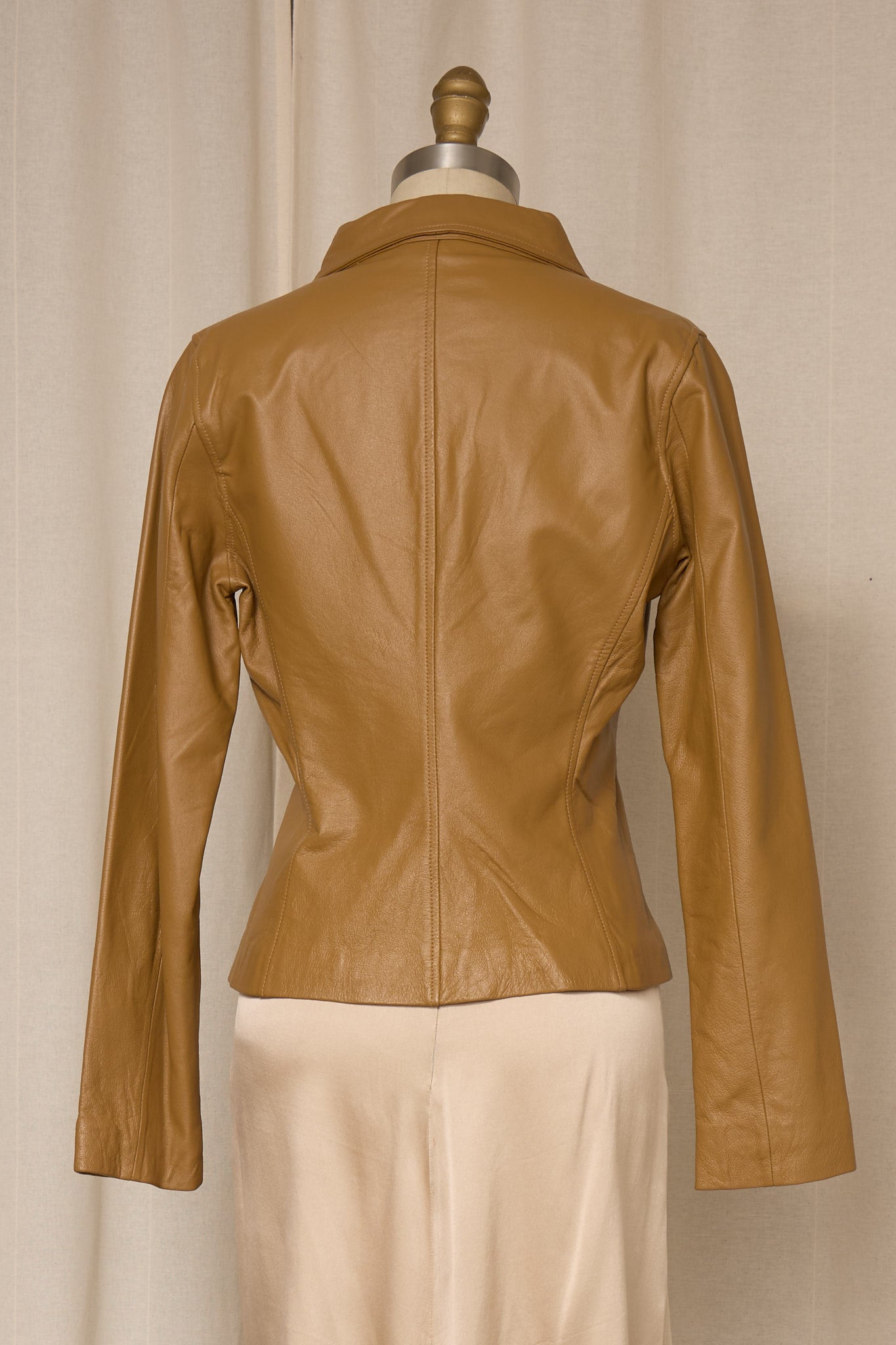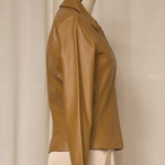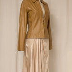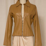 Vintage tan leather jacket with a fitted silhouette and clean open-front design. Soft genuine leather with subtle shaping through the waist and elongated sleeves. Minimal, elegant piece that layers beautifully over dresses or tailored separates. Very good vintage condition.