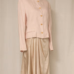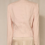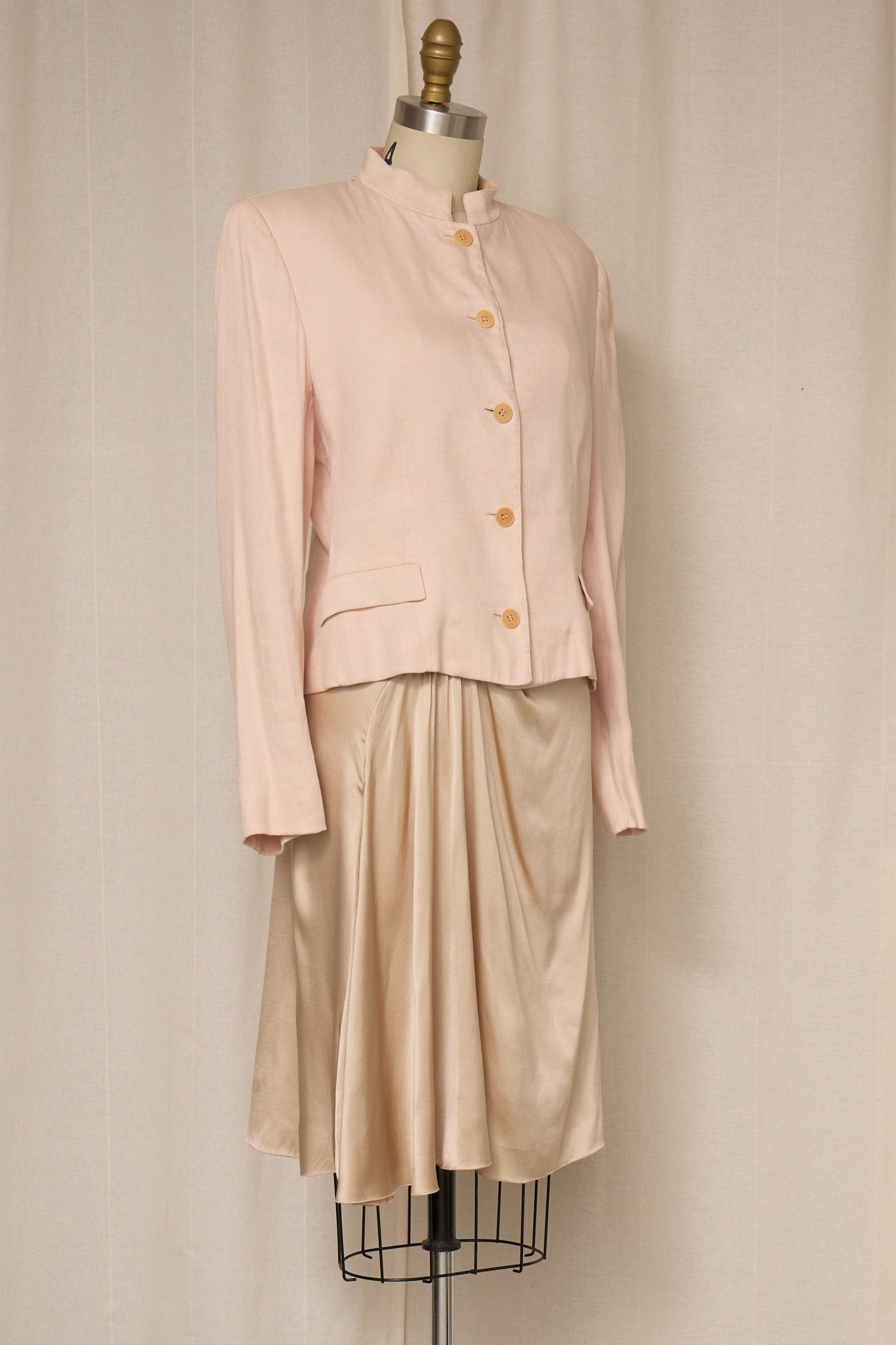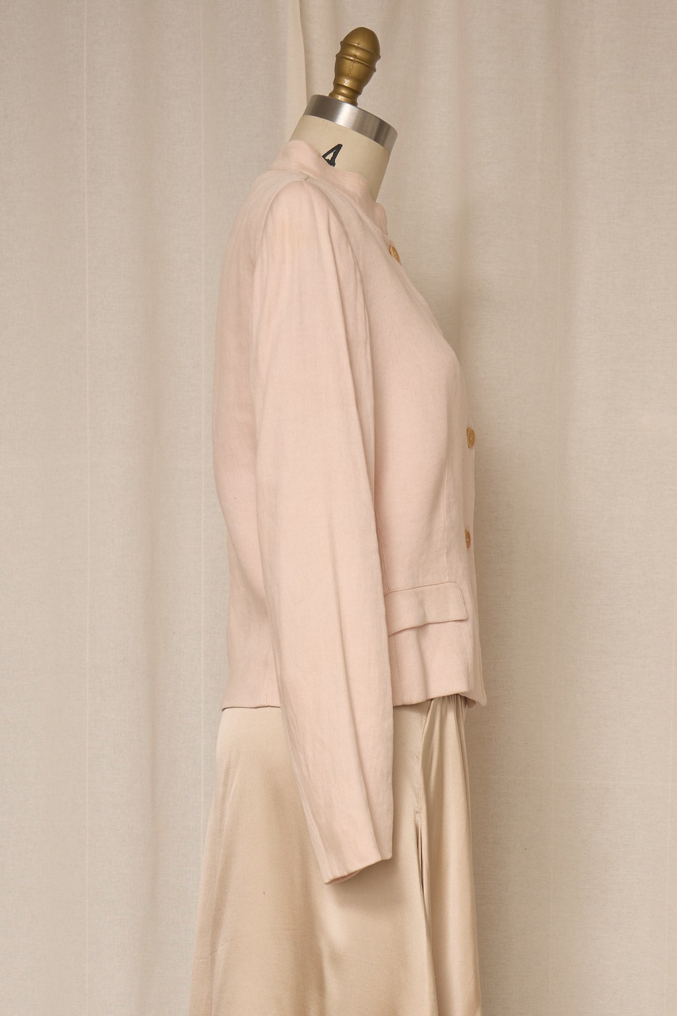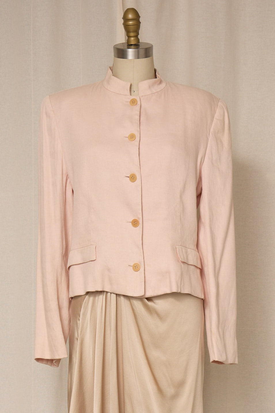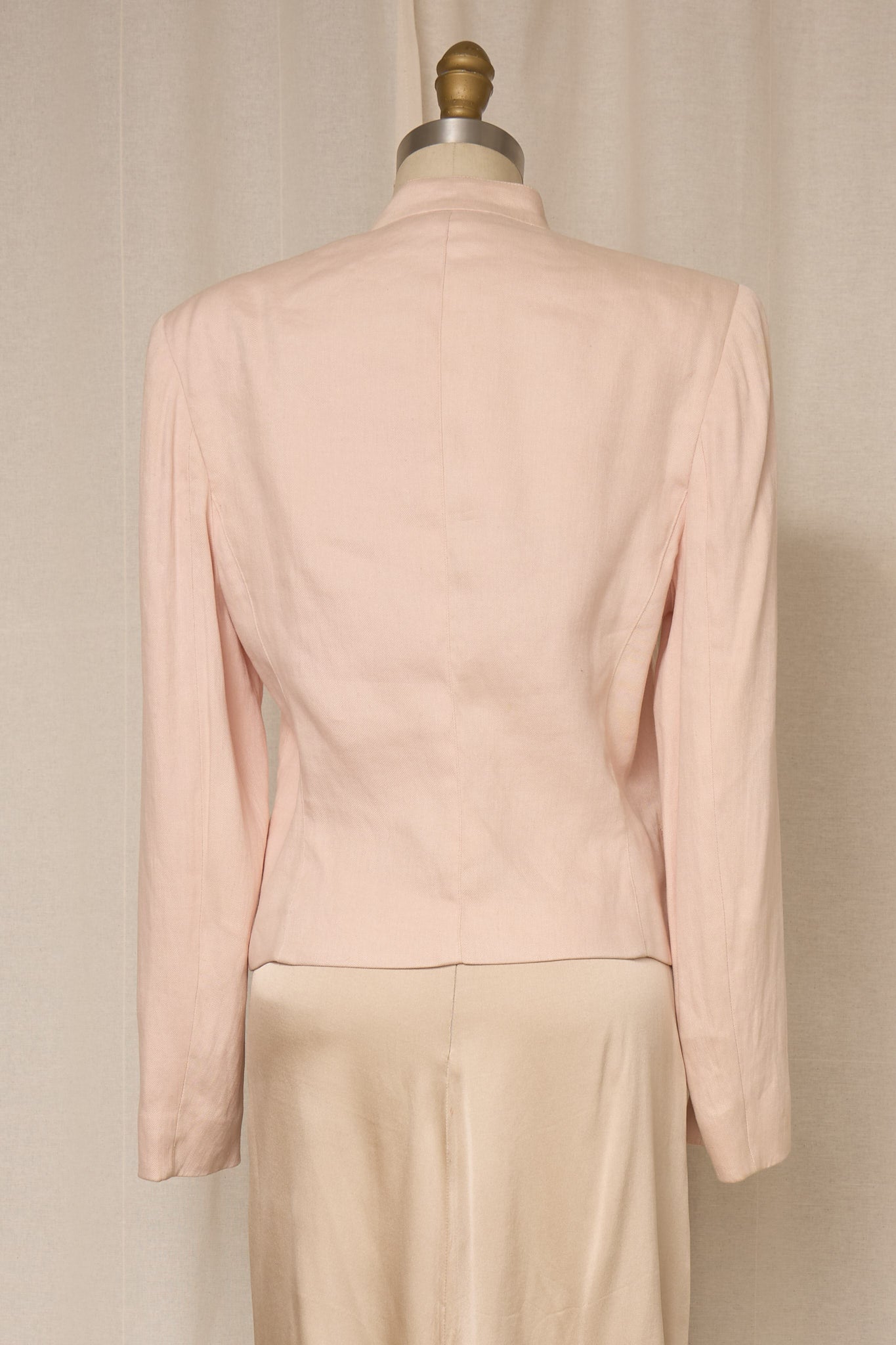 Light pink vintage Calvin Klein jacket with a banded neckline, tailored fit, button closure, and two decorative front pockets. In very good vintage condition, no signs of damage or wear.