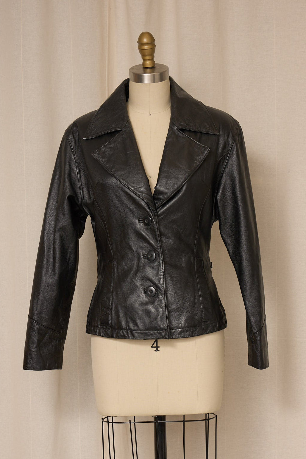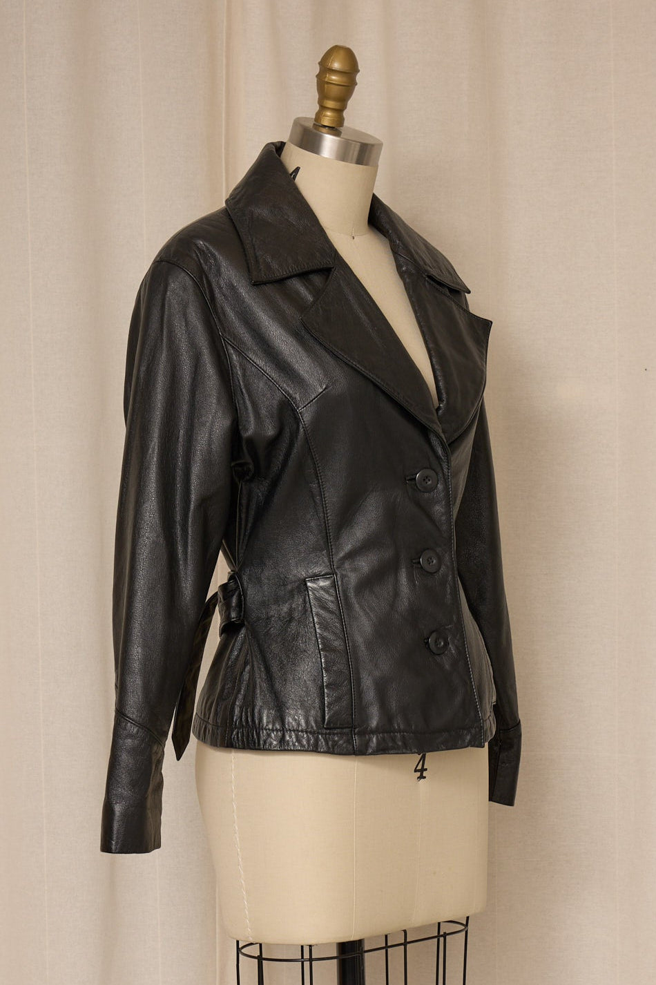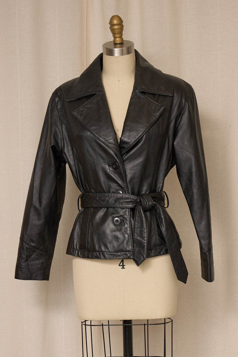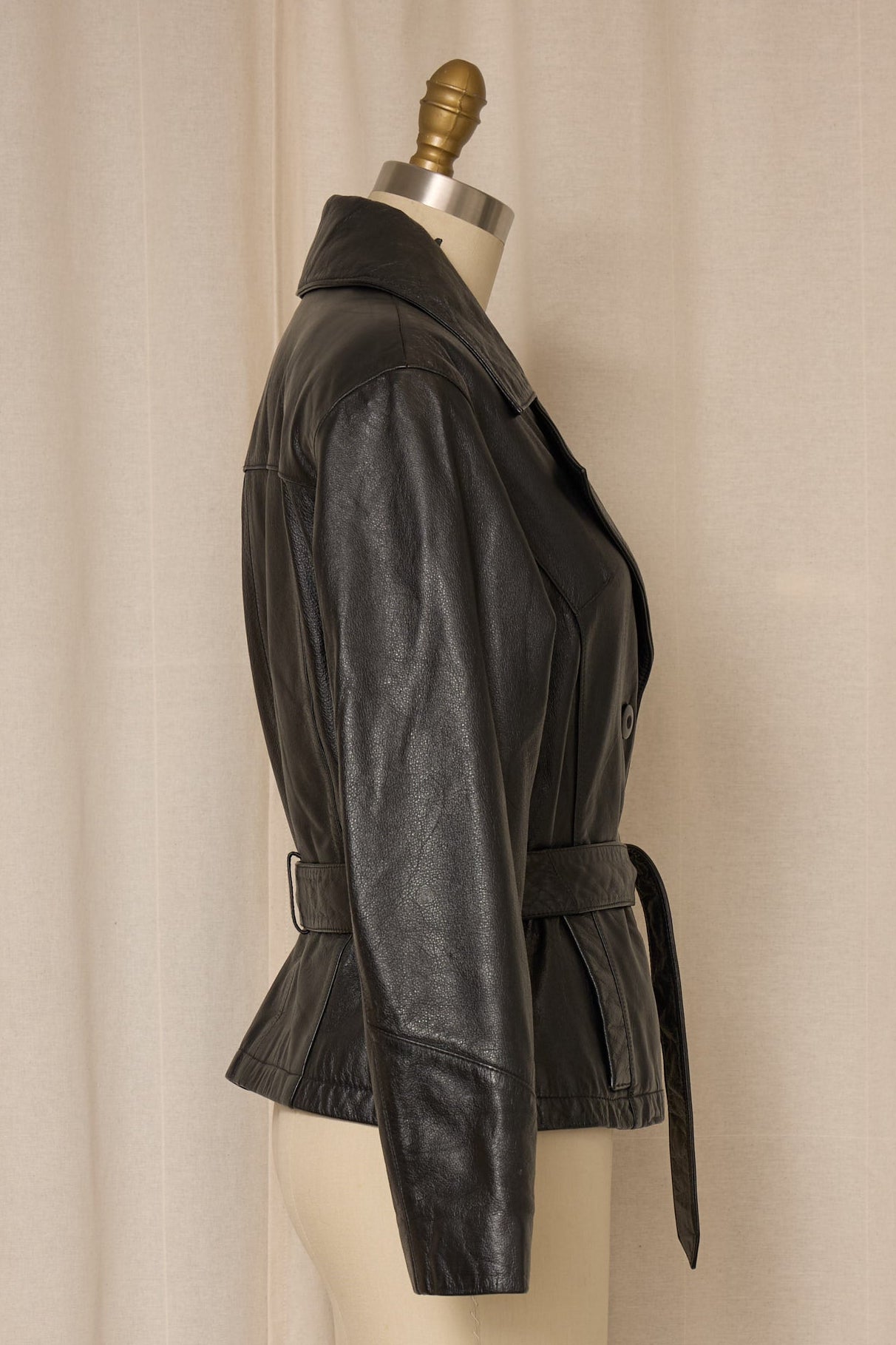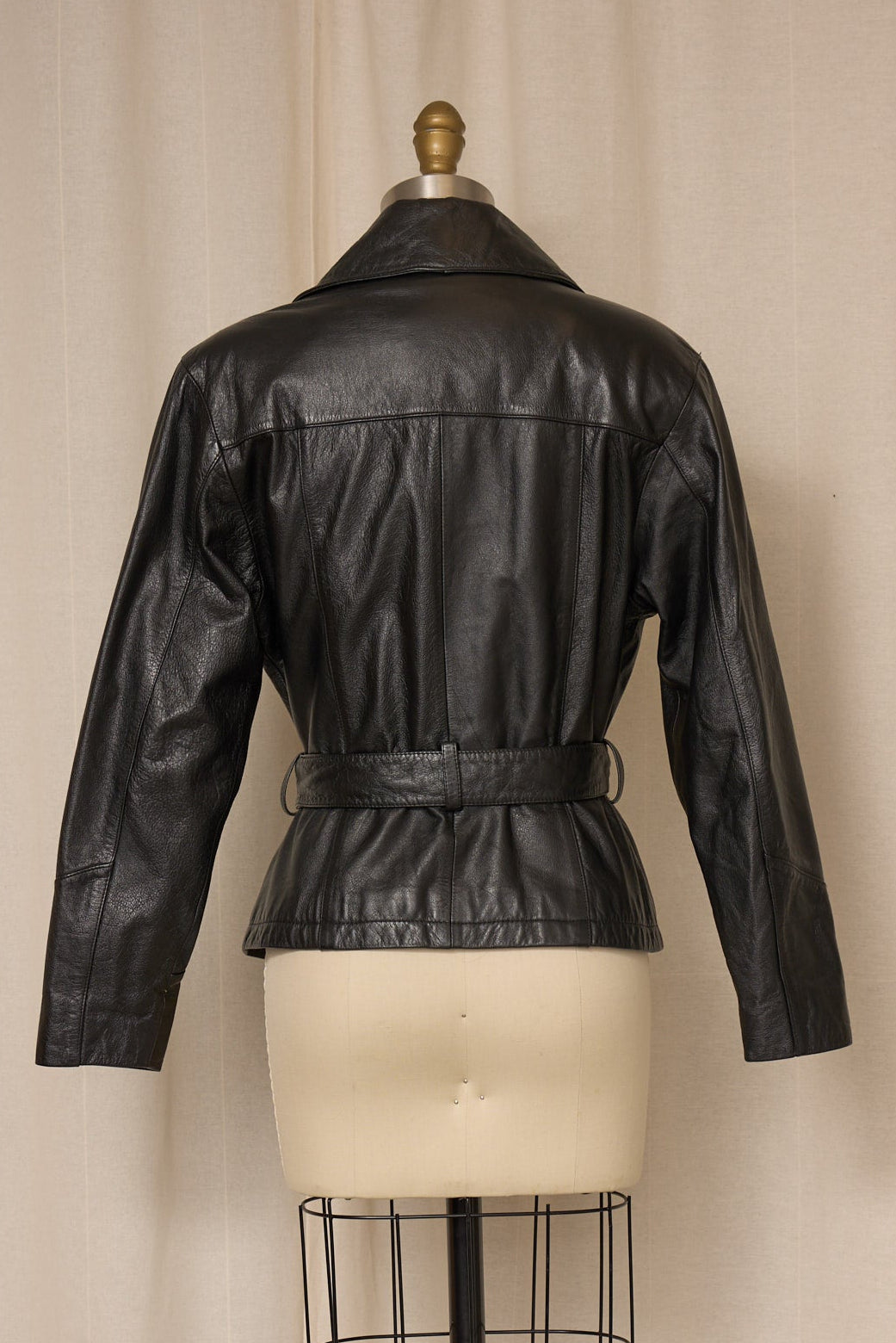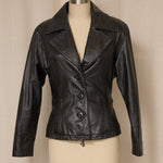 Fitted black 100% leather jacket, structured tailored fit with wraparound belt that ties at waist. Button closure, two front pockets. Very good vintage condition, no flaws.