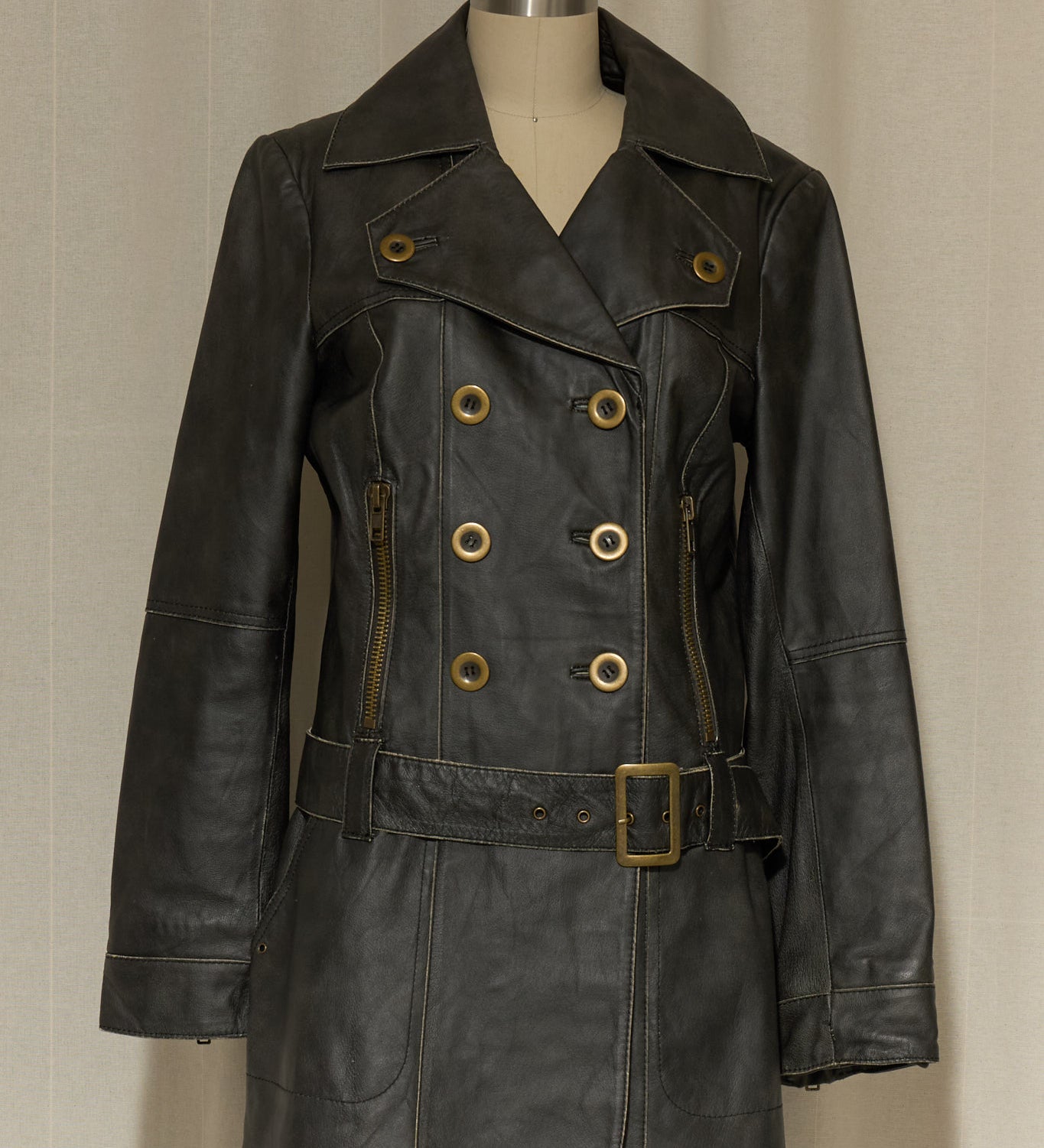 Black Leather Double-Breasted Belted Coat