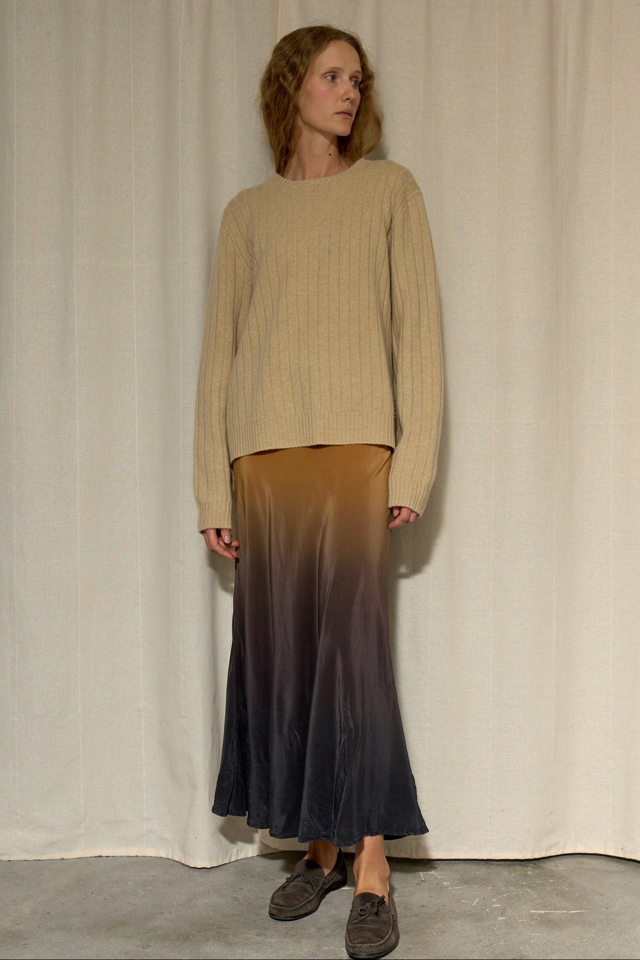 Woman wearing a beige sweater and gradient skirt against a plain background