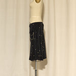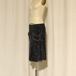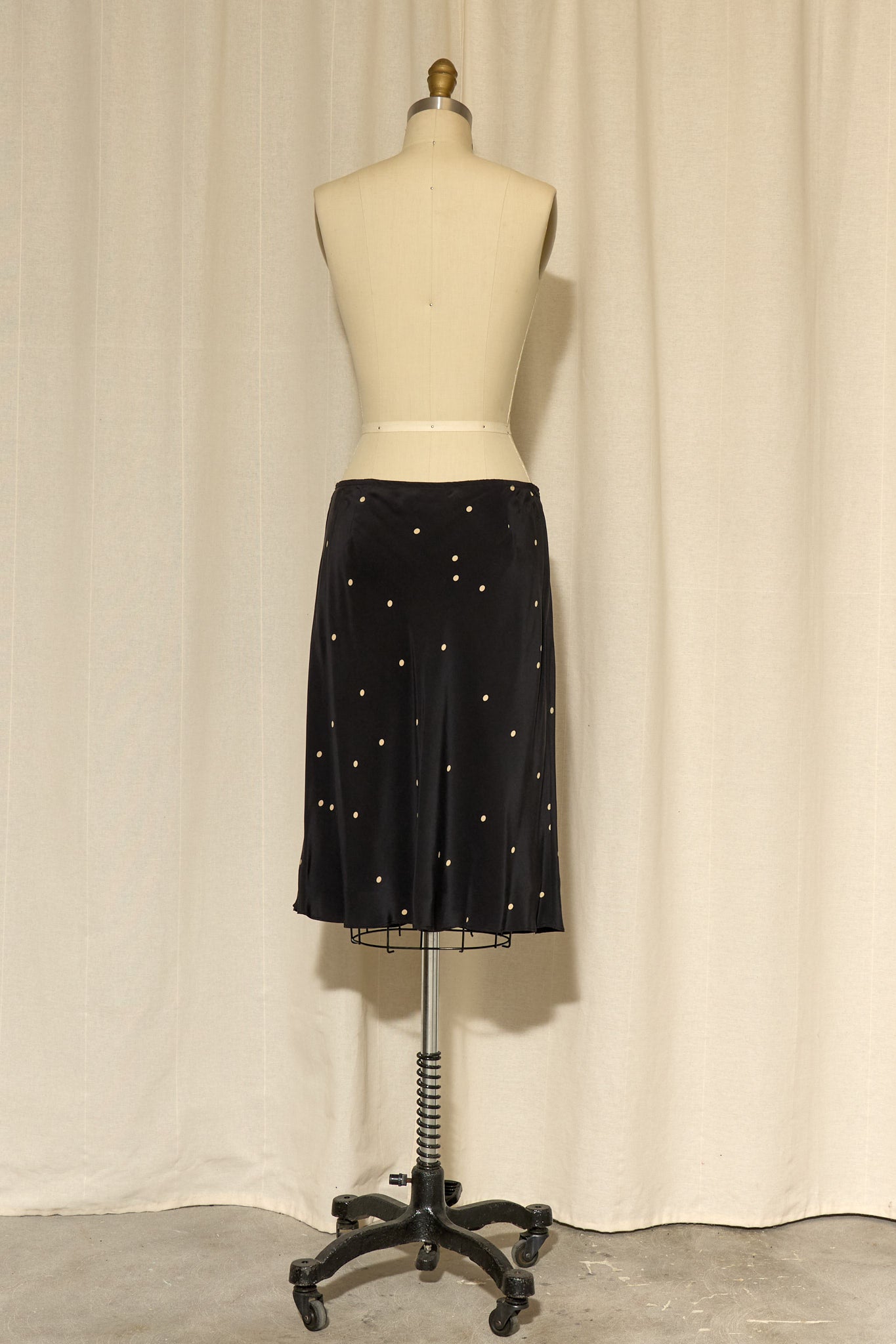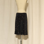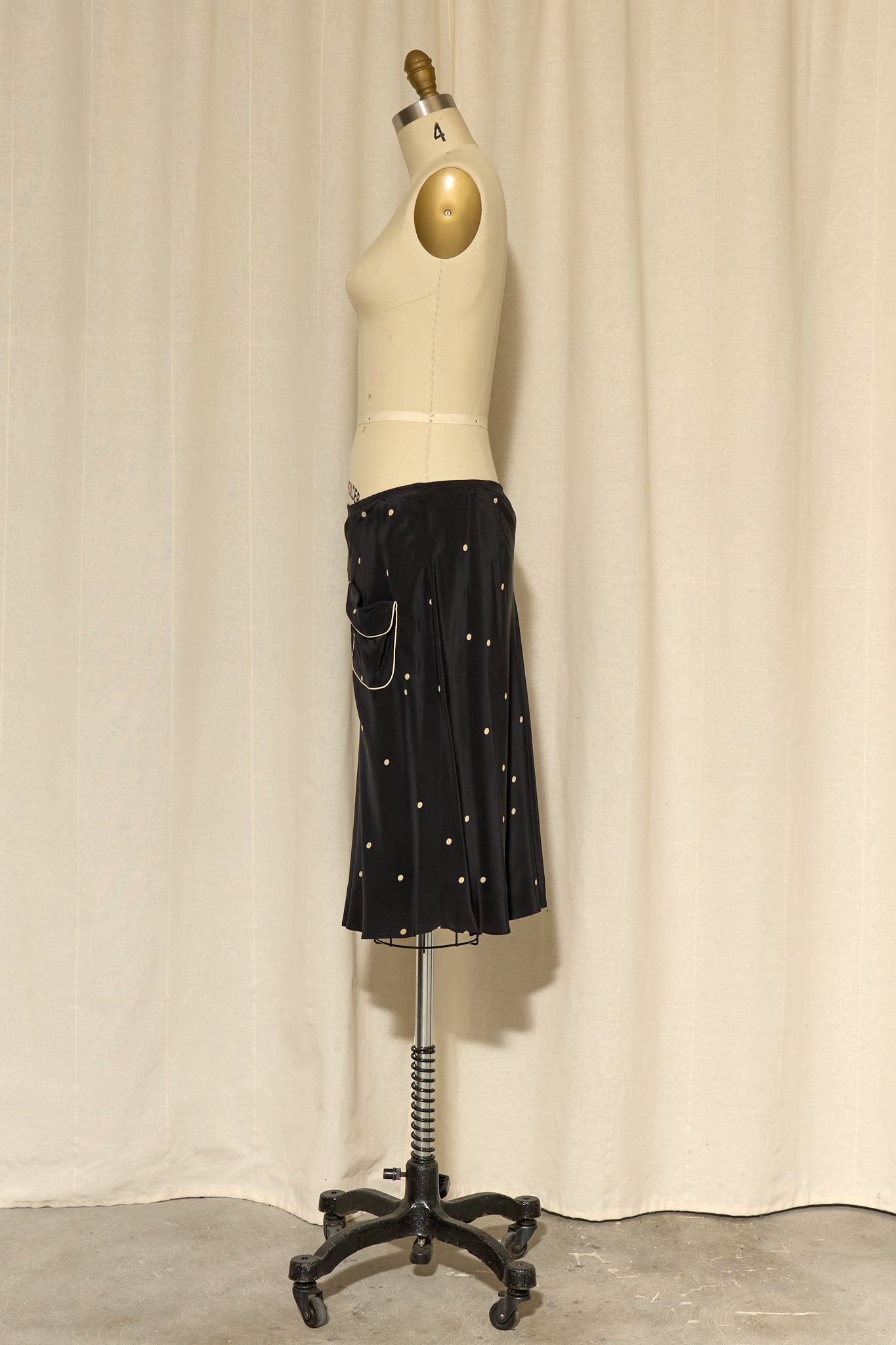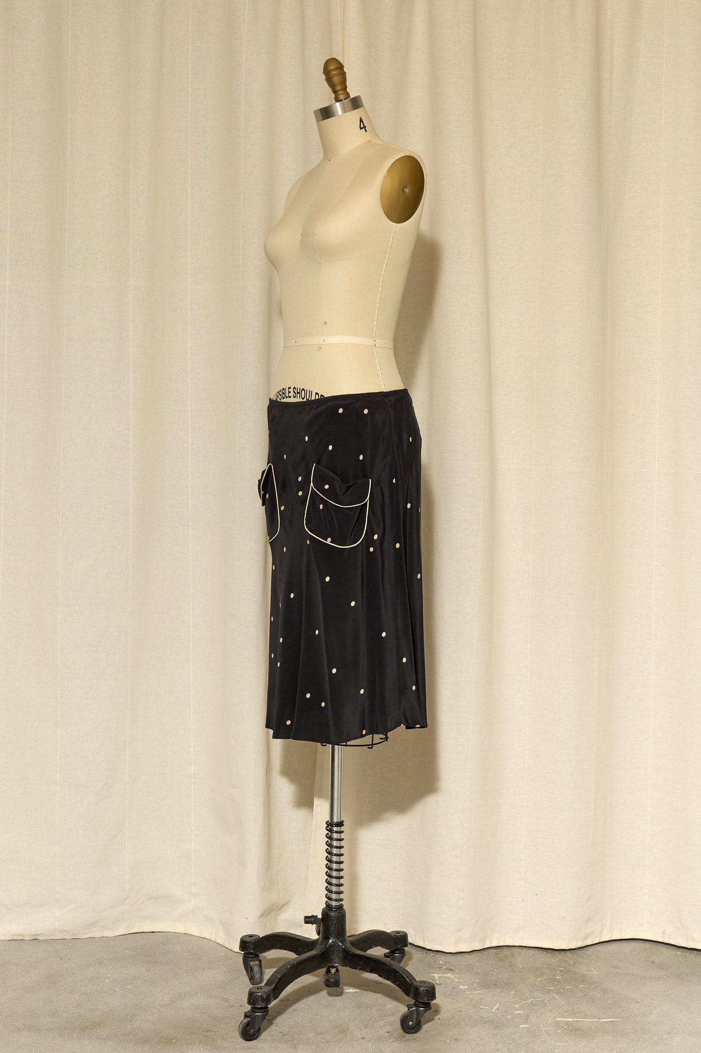 Black silk skirt with cream polka dots and front pockets with cream piping. Fully lined, in very good condition