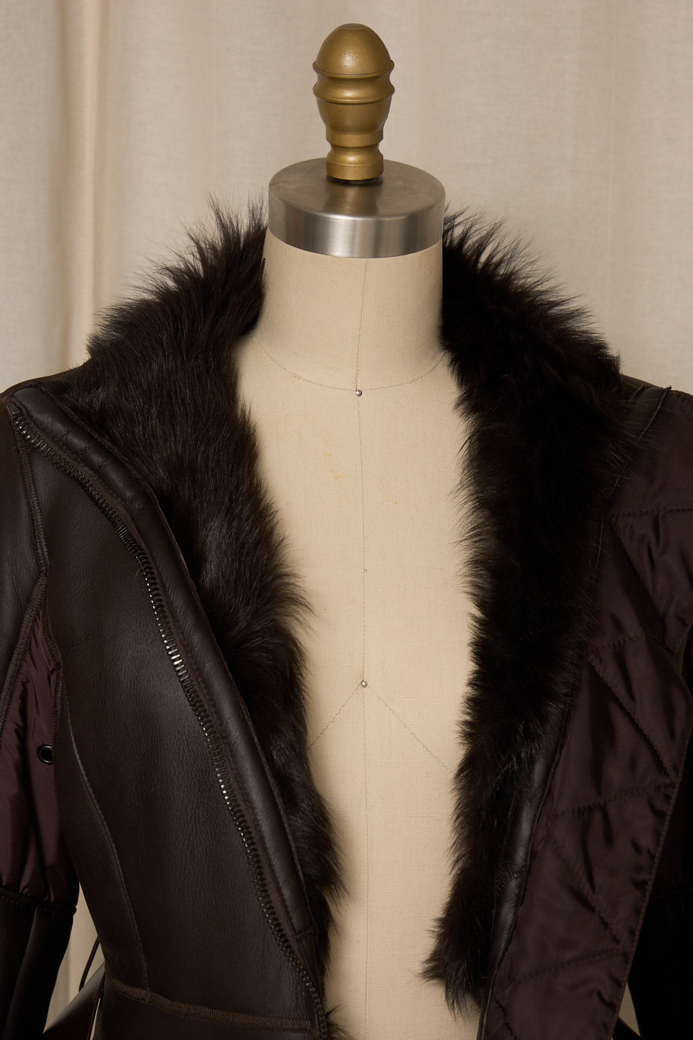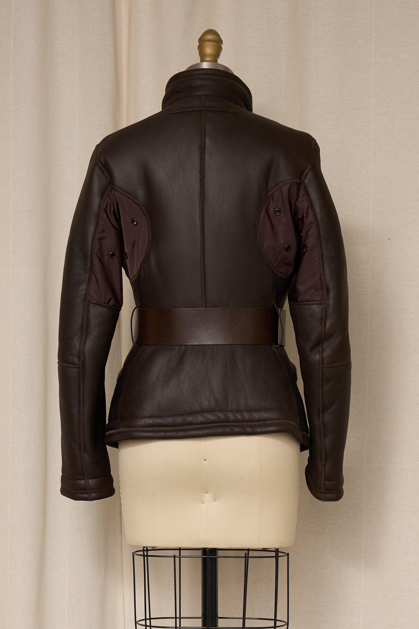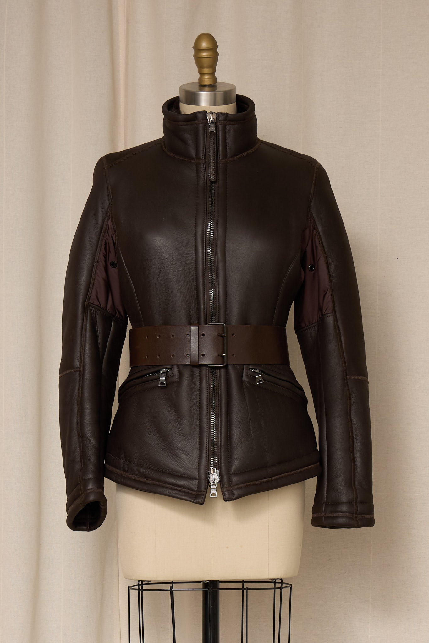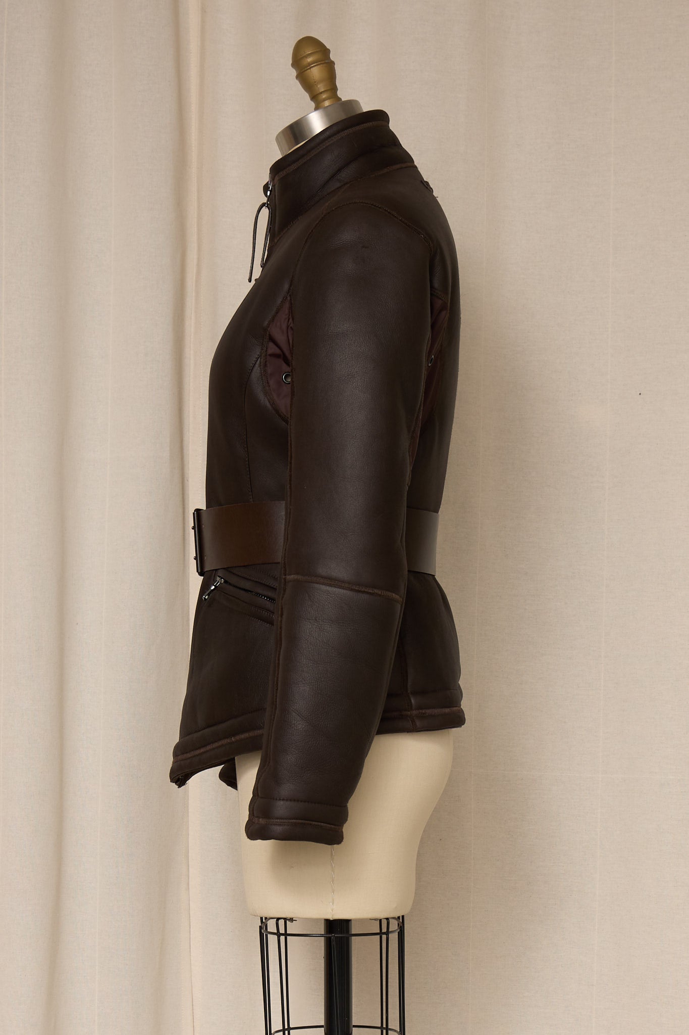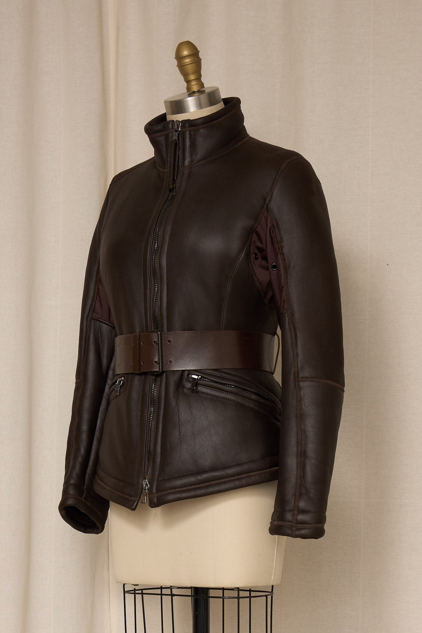 Vintage Prada brown shearling jacket with belt detail.