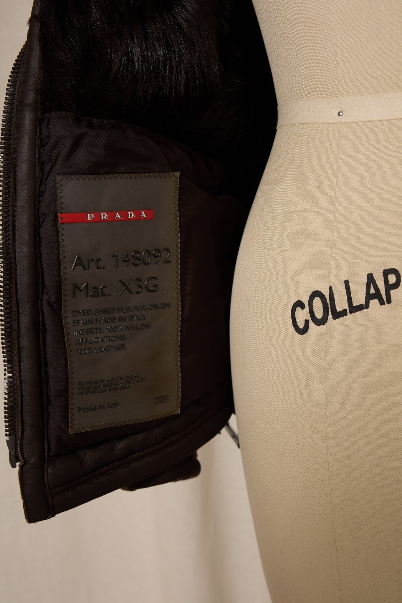 Structured fitted silhouette with high stand collar, zip-front closure, and wide leather belt at waist. Paneled construction with zip pockets and contrast interior lining. Based on label style, materials, and construction, this piece dates to the early 2000s (circa 2000–2004) Prada era. Made in Italy.