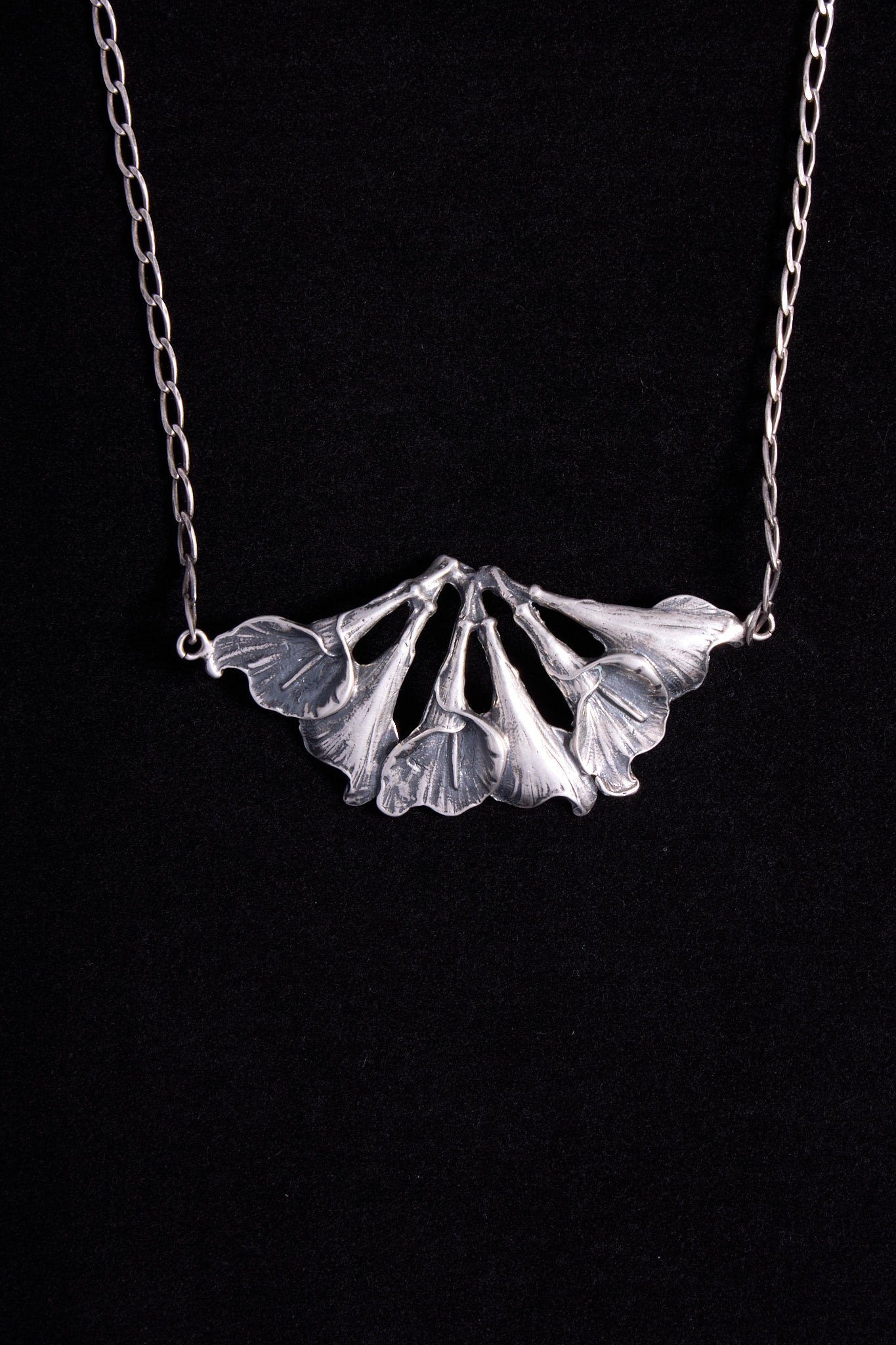 Vintage sterling silver sculptural fan necklace with an organic, floral-inspired form