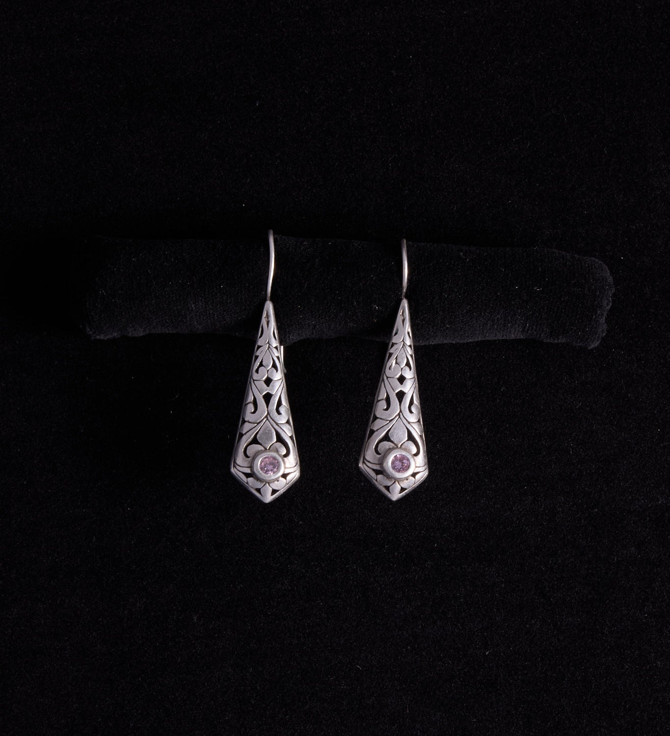 Sterling Silver Long Floral Diamond Shaped Drop Earrings with Pink Stone