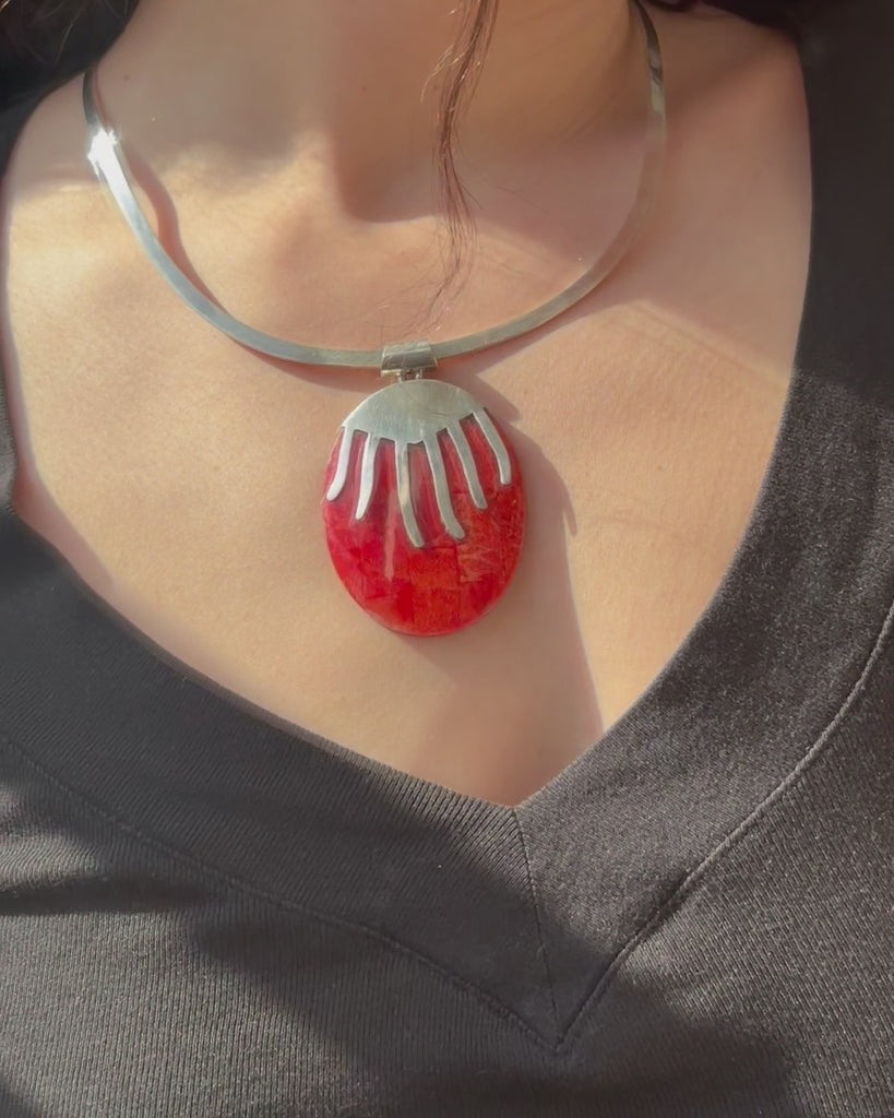 Sterling Silver Choker Necklace with Oval Orange Stone Pendant