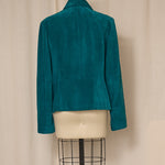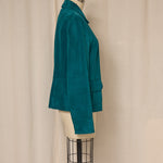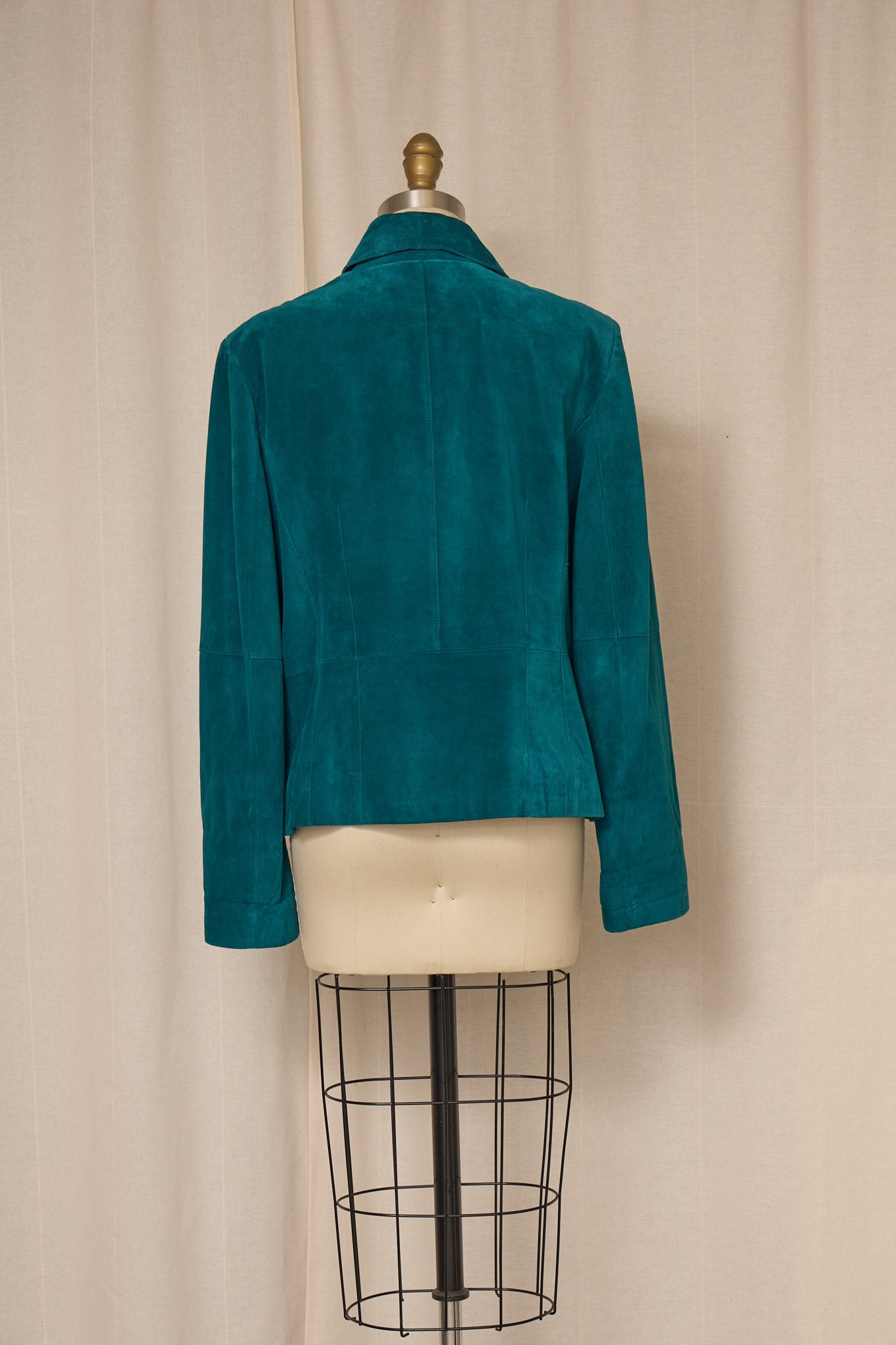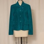 Blue suede jacket with structured fit. 100% suede leather outer with synthetic inner lining. Button front closure, two front pockets. Very good vintage condition, no flaws or damage.