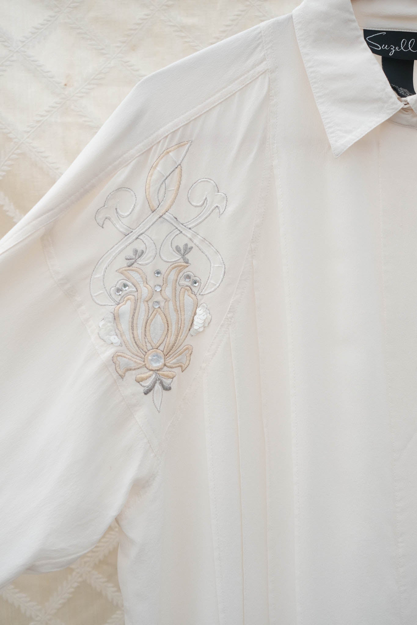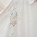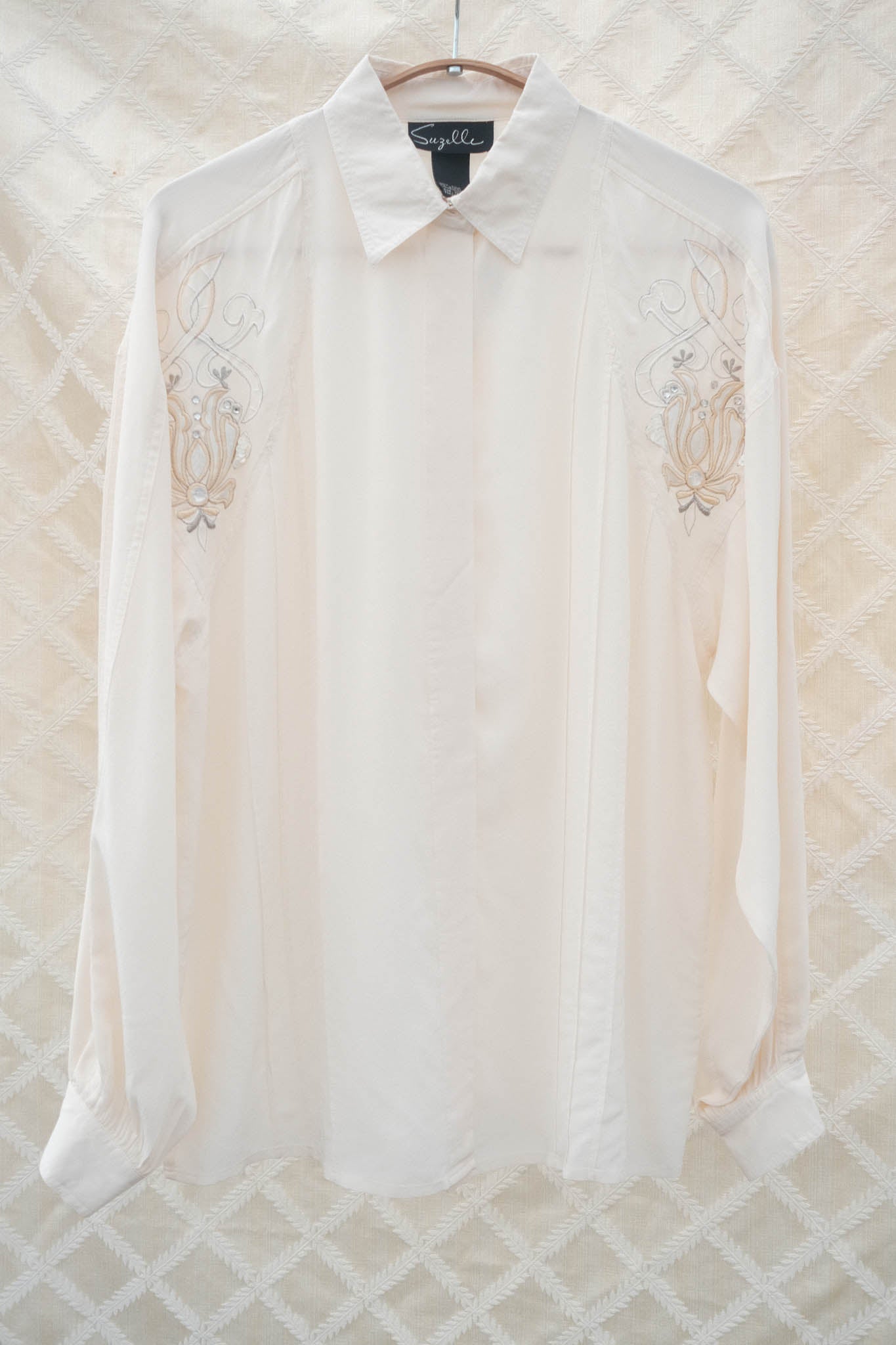 This vintage Suzelle blouse is crafted from soft cream silk with delicate embroidered motifs on each shoulder. Designed with a pointed collar, concealed button placket, and gently gathered cuffs, it’s perfect for pairing with tailored trousers or layering under a blazer.