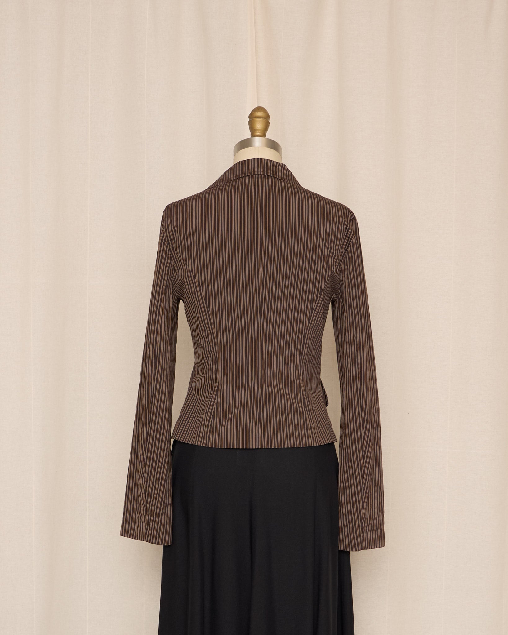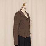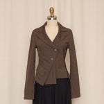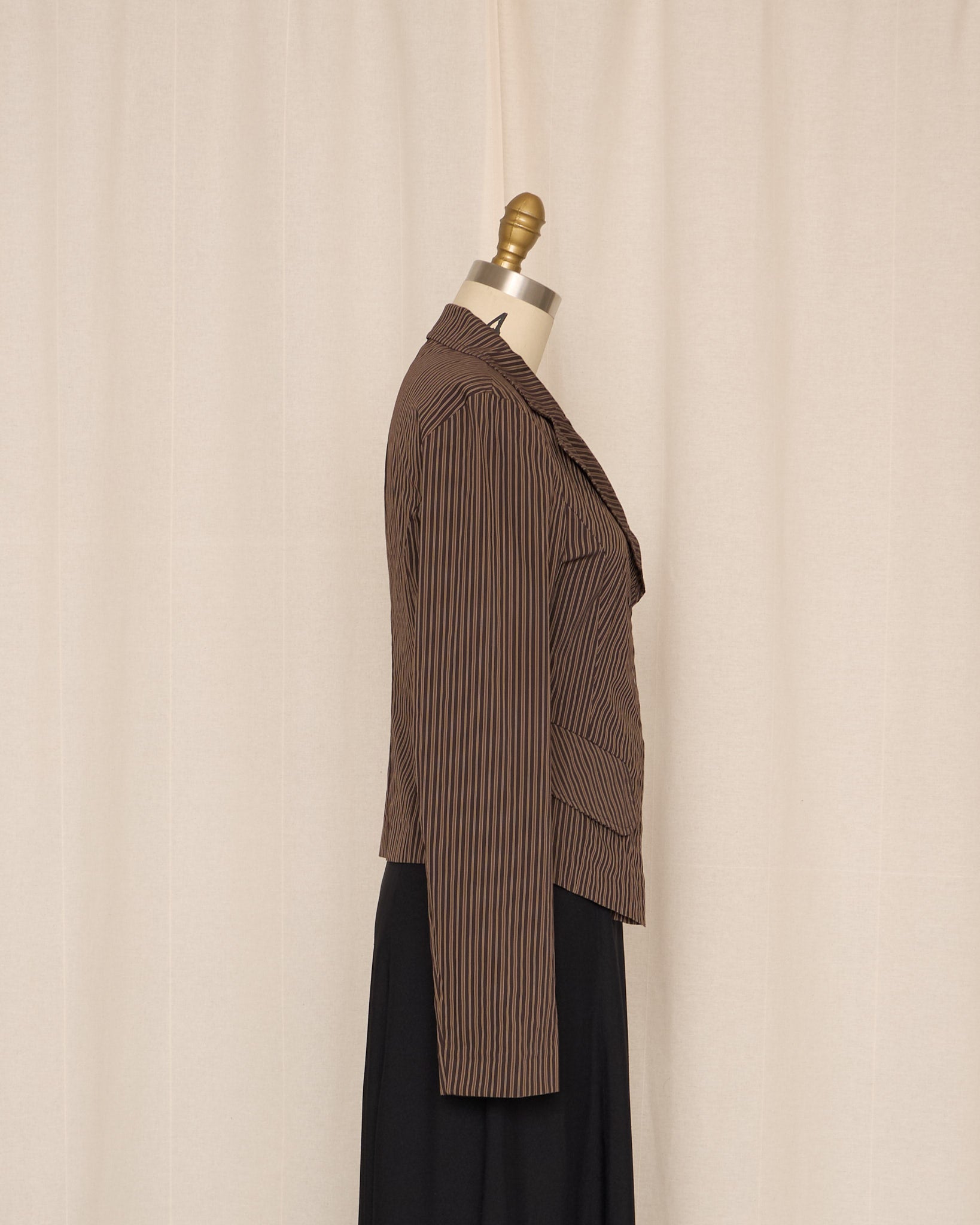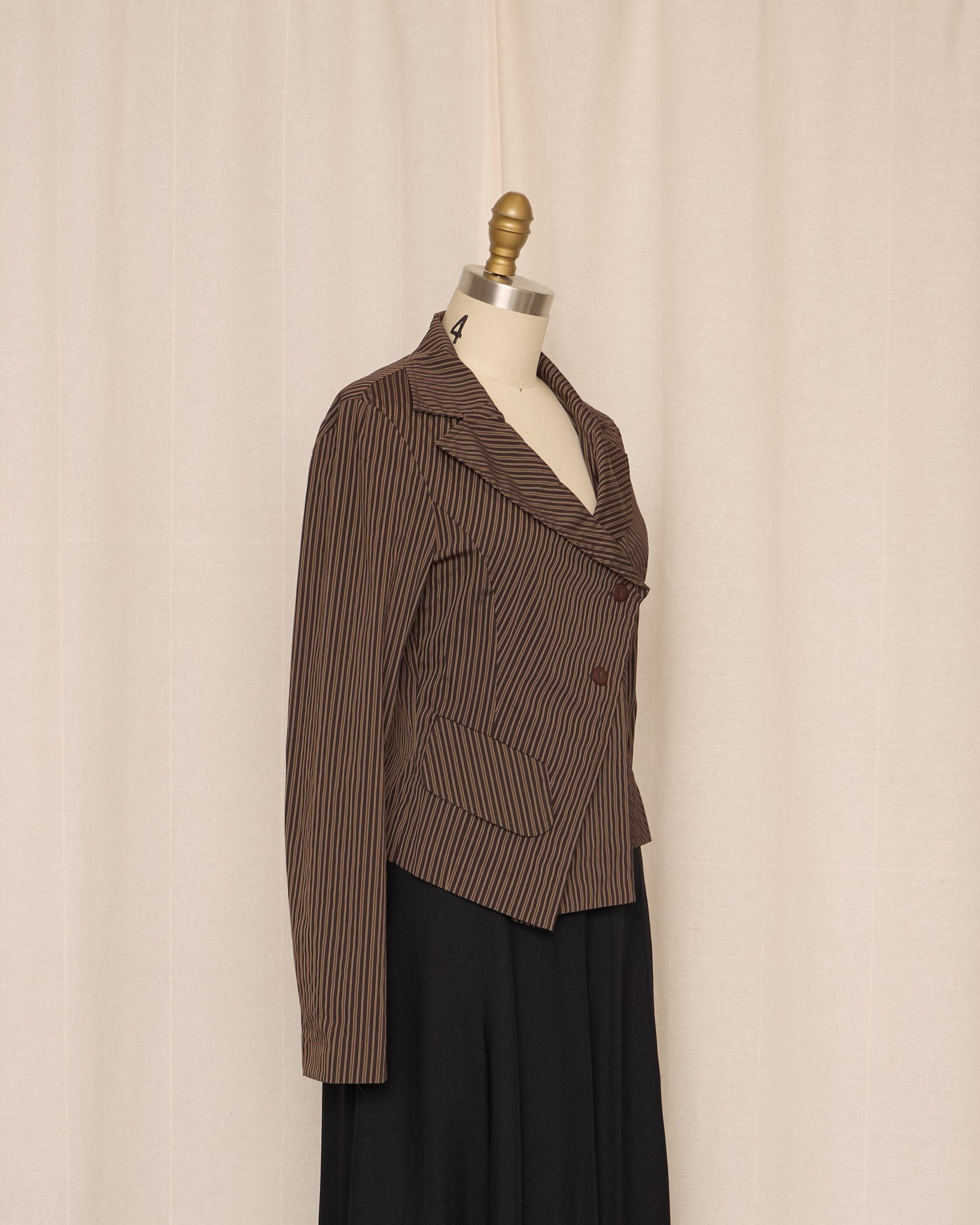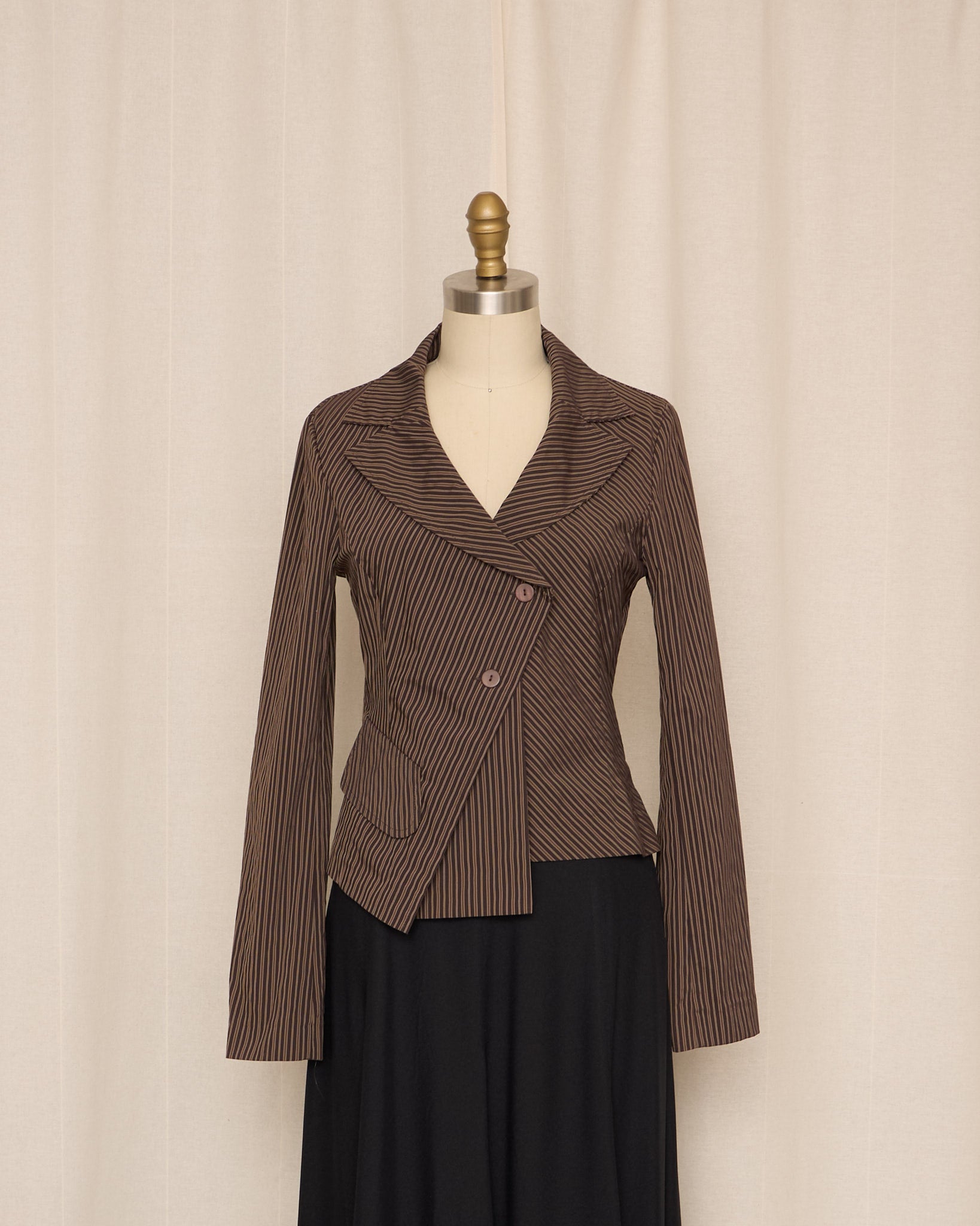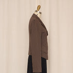 Structured cotton-blend jacket with a sharp asymmetric wrap front and fine vertical stripe pattern. Designed with a sculpted waist and angular hem, it creates a strong, tailored silhouette while maintaining a lightweight, wearable feel.