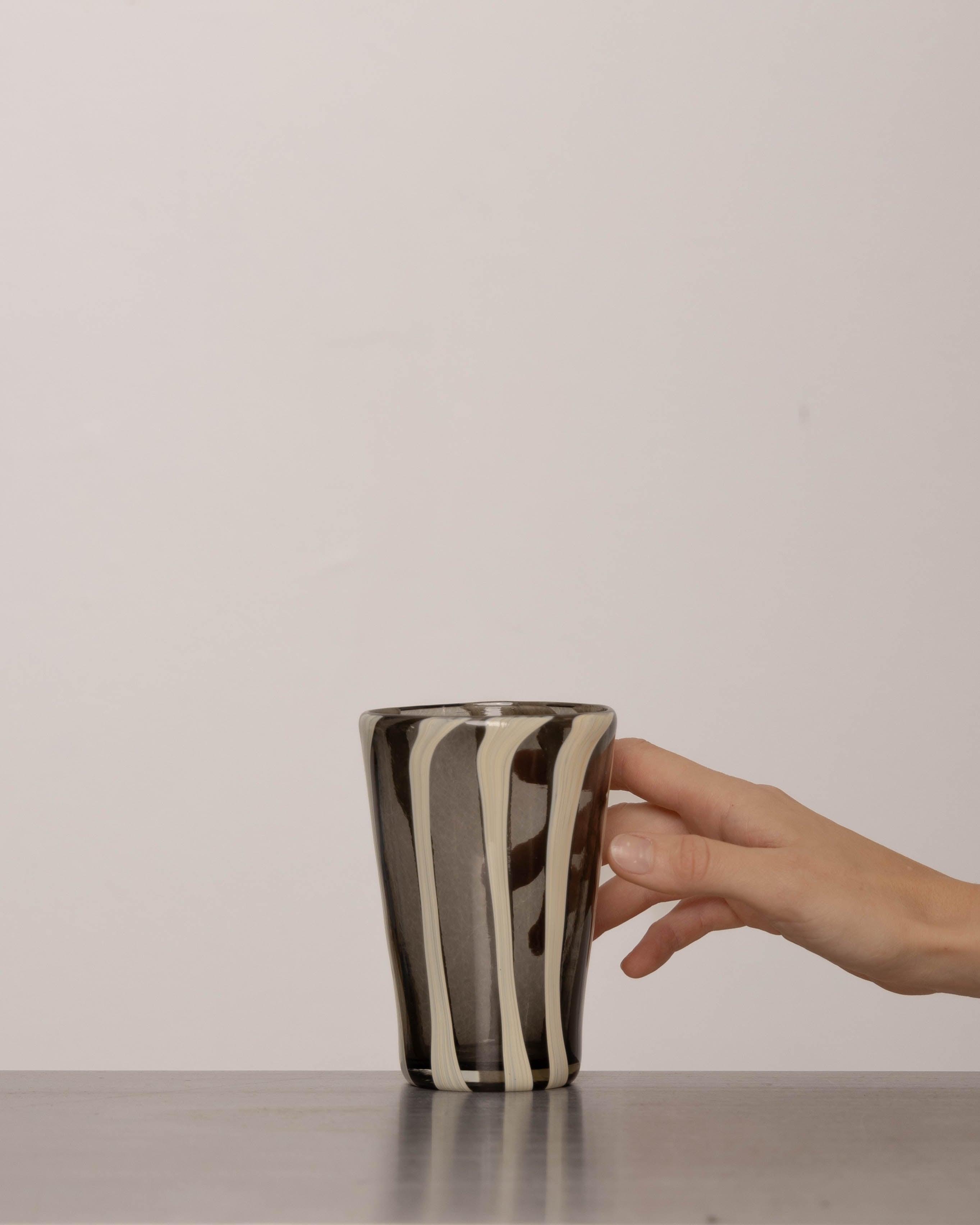 Discover the YAKUSH STRIPS Glass B&W – a 5.3" tall, handcrafted striped glass tumbler made from recycled glass, perfect for summer drinks.