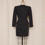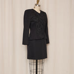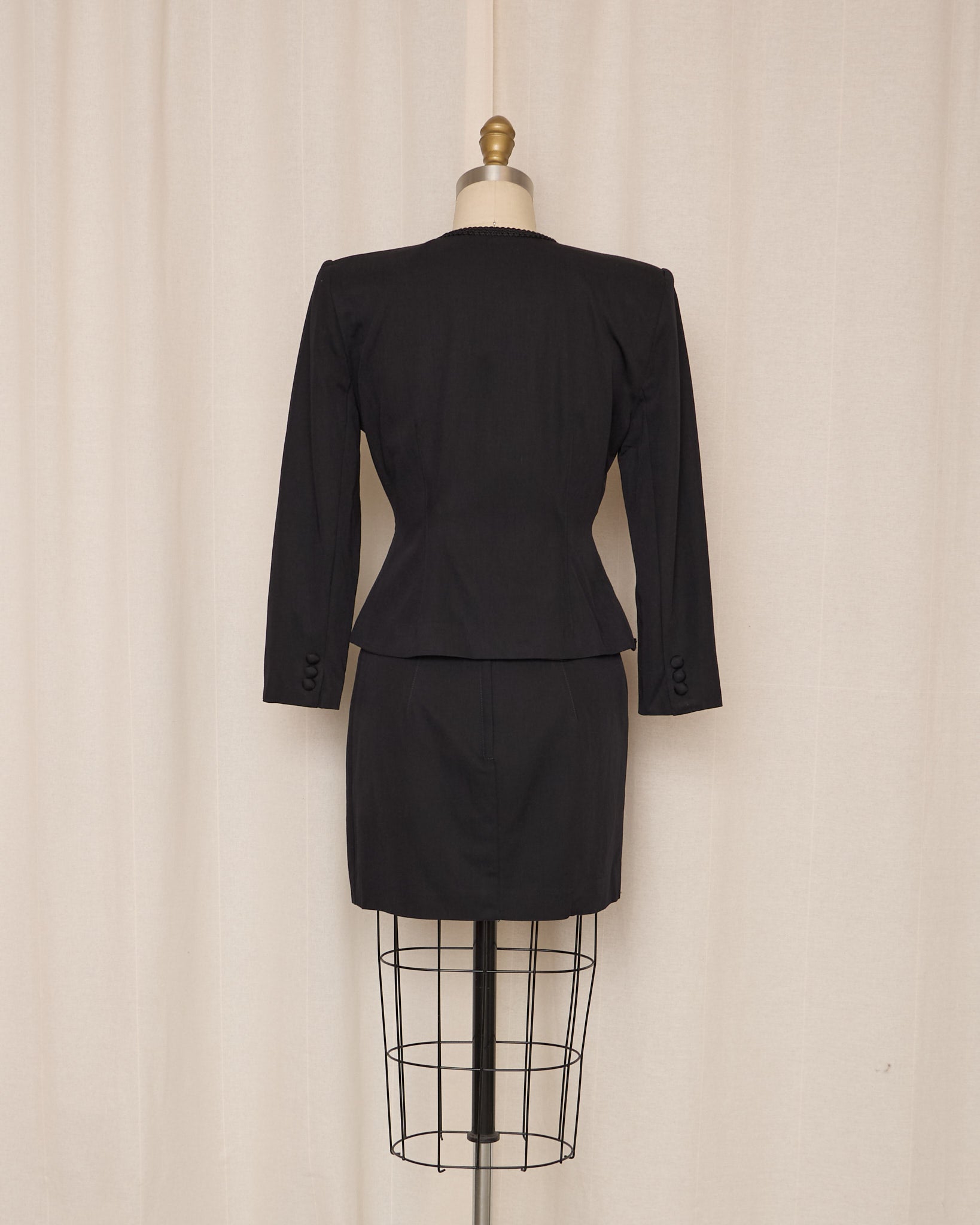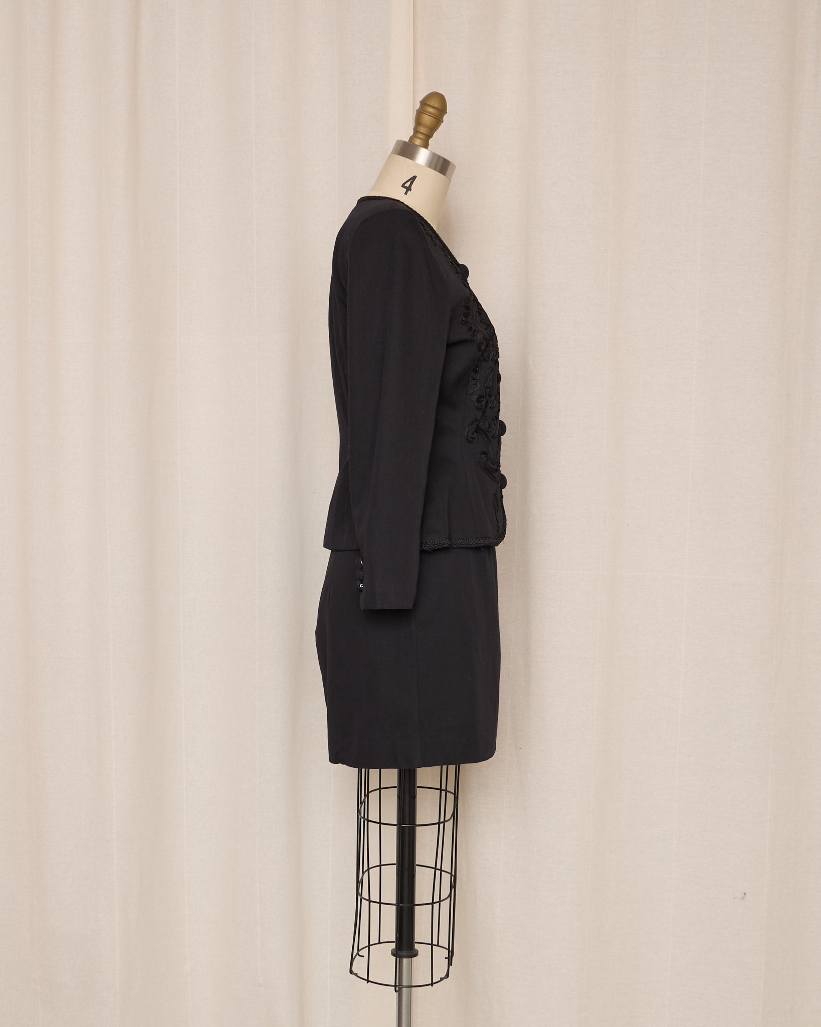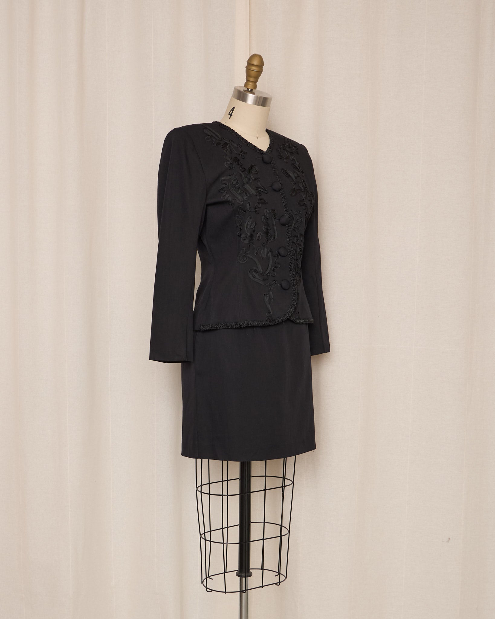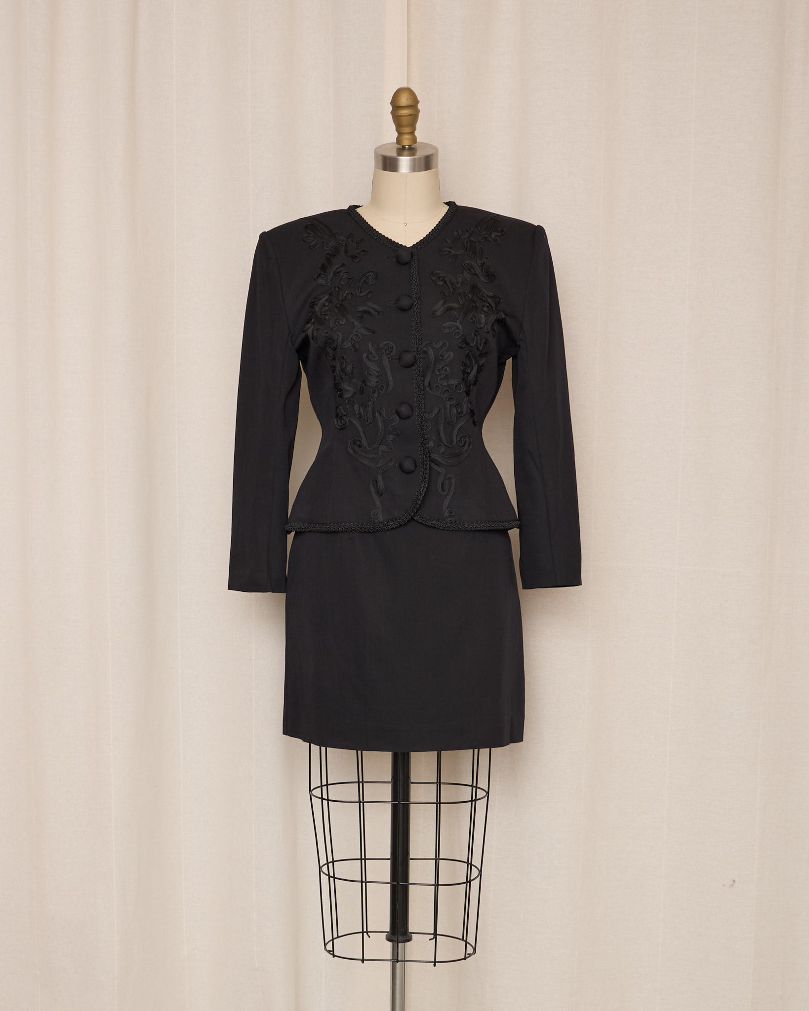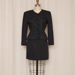 This vintage Tina Hagen black jacket and matching skirt set. Jacket features a fitted silhouette, structured shoulders, textured embroidery along the front, and covered button closure. Coordinating skirt is simple and fitted, with a back zipper closure. Made in USA.