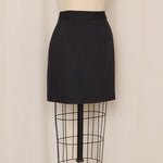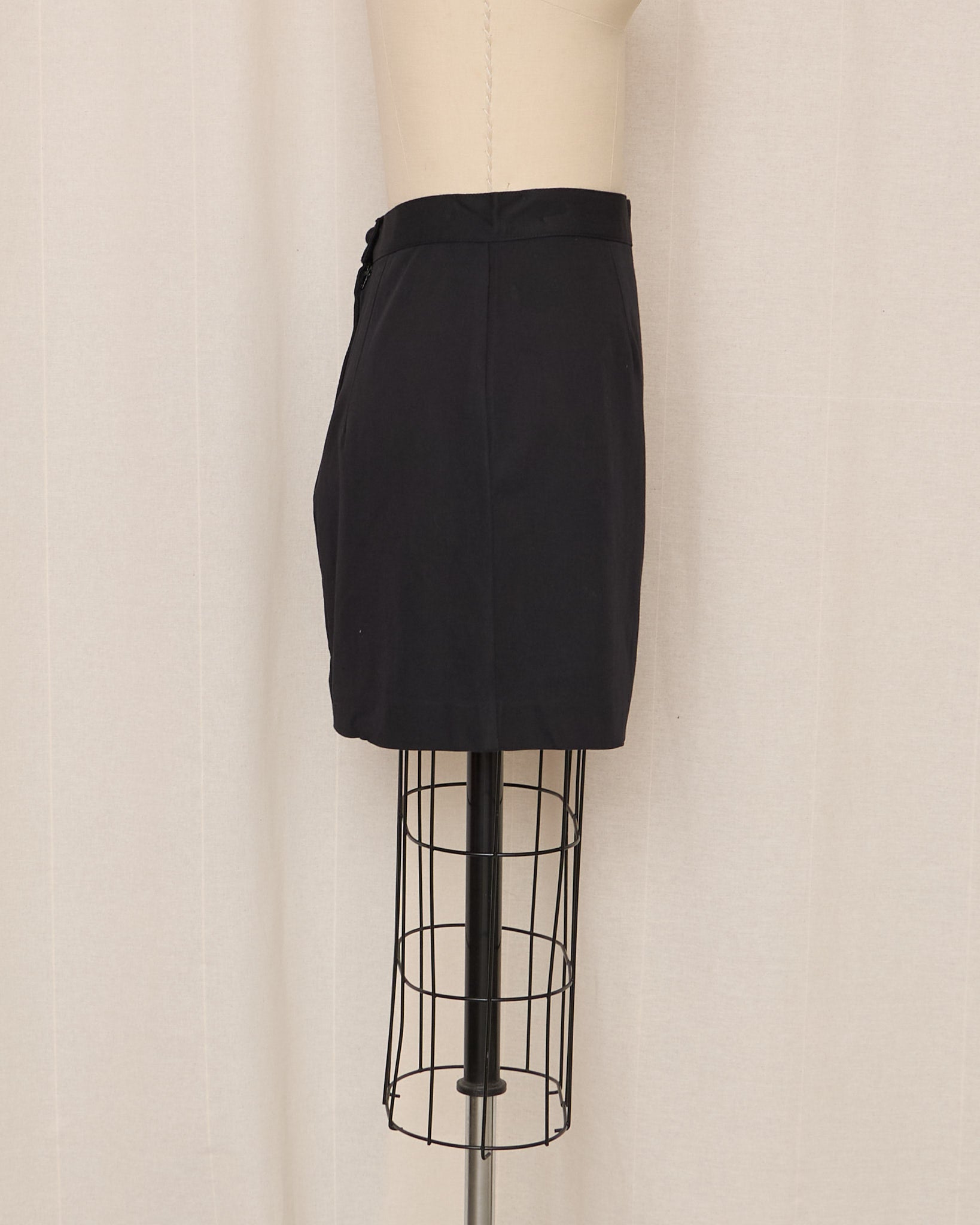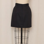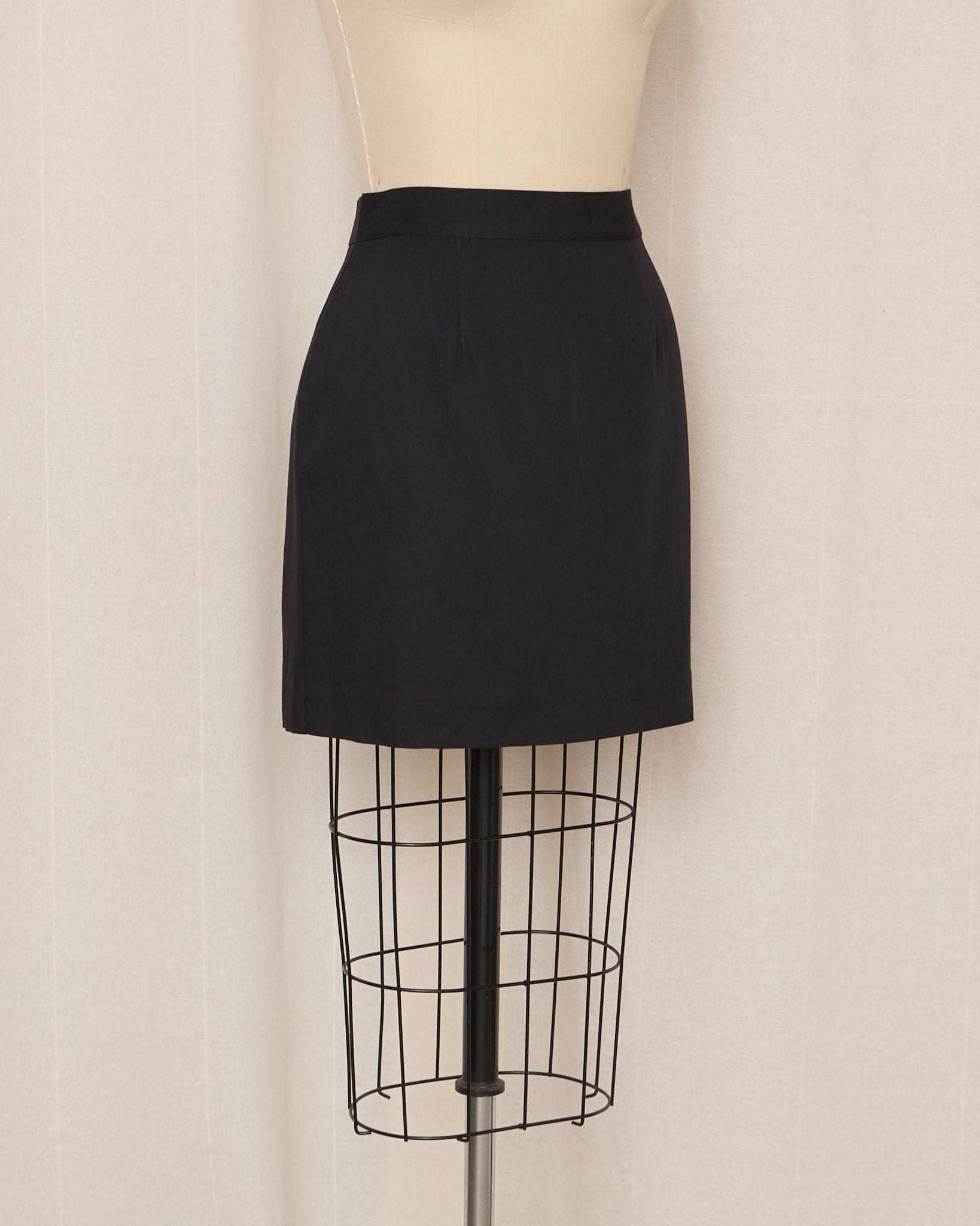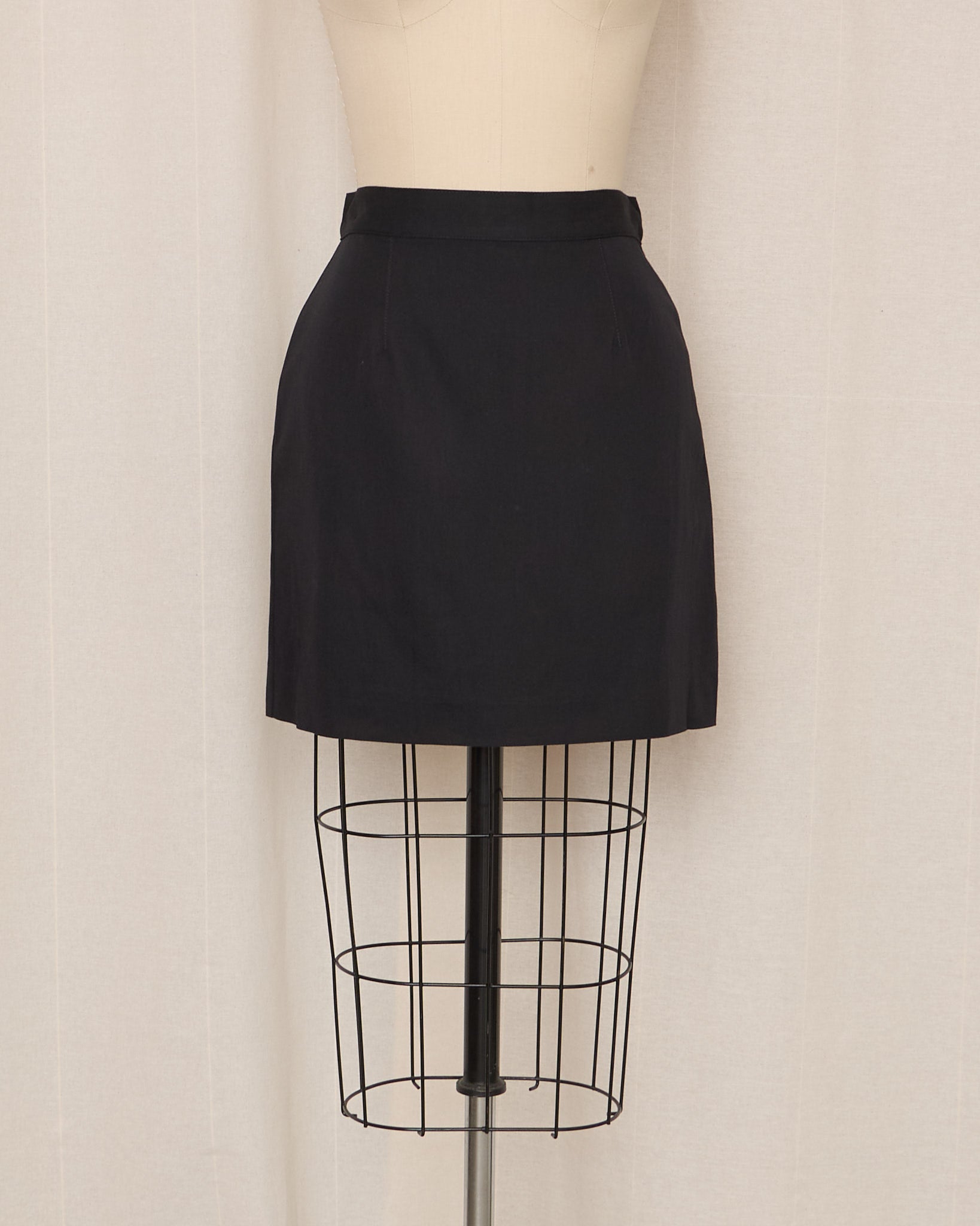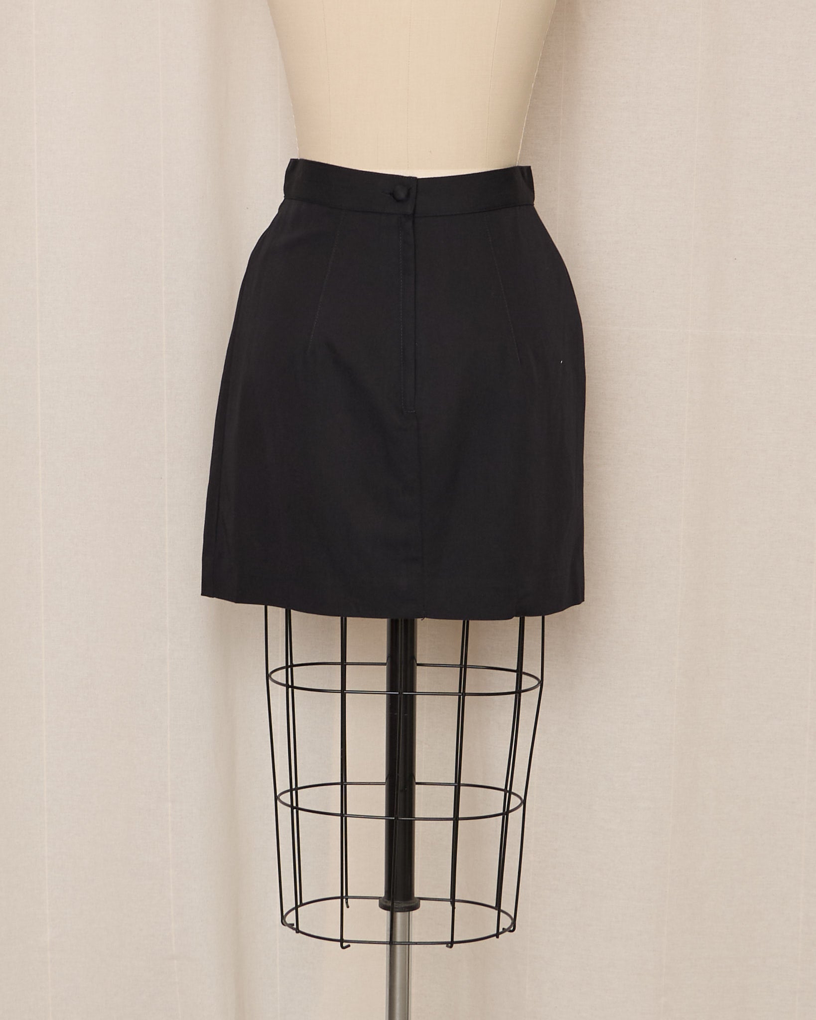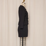 This vintage Tina Hagen black jacket and matching skirt set. Jacket features a fitted silhouette, structured shoulders, textured embroidery along the front, and covered button closure. Coordinating skirt is simple and fitted, with a back zipper closure. Made in USA.
