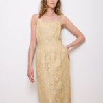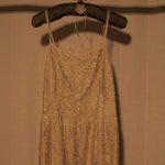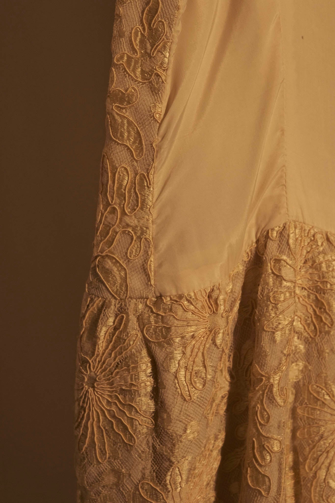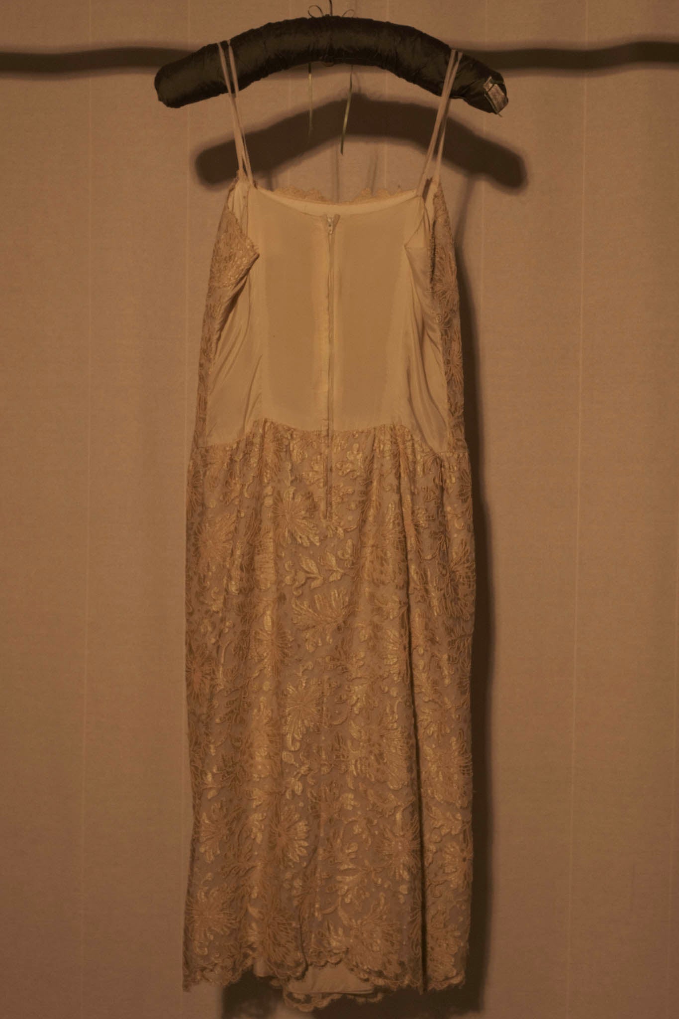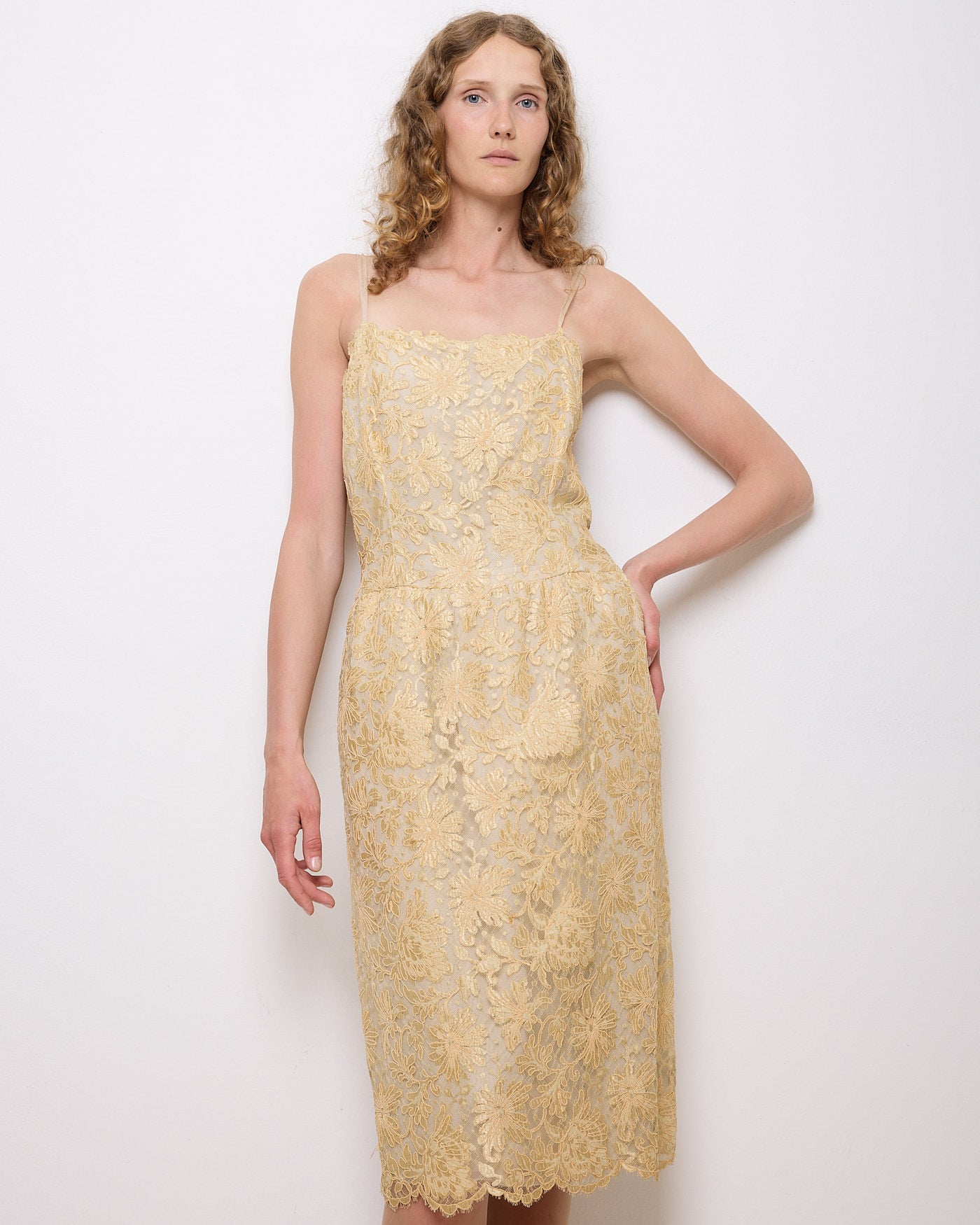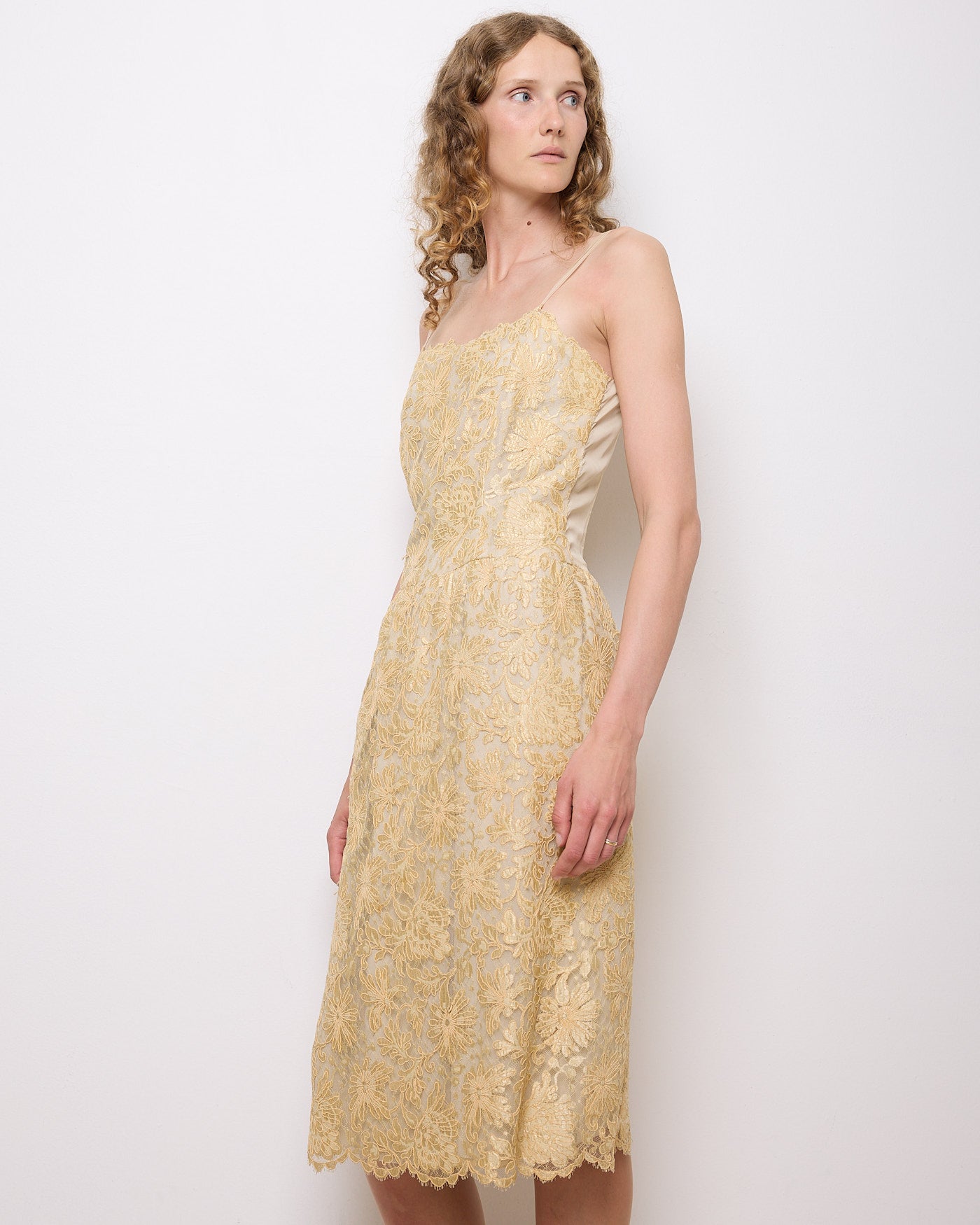 Delicate and romantic, this vintage pale gold lace slip dress features an intricate floral embroidered overlay and a classic slip silhouette. Designed with dainty spaghetti straps and a scalloped lace hem, this piece is perfect for weddings, garden parties, or styled down with a knit sweater for everyday elegance.